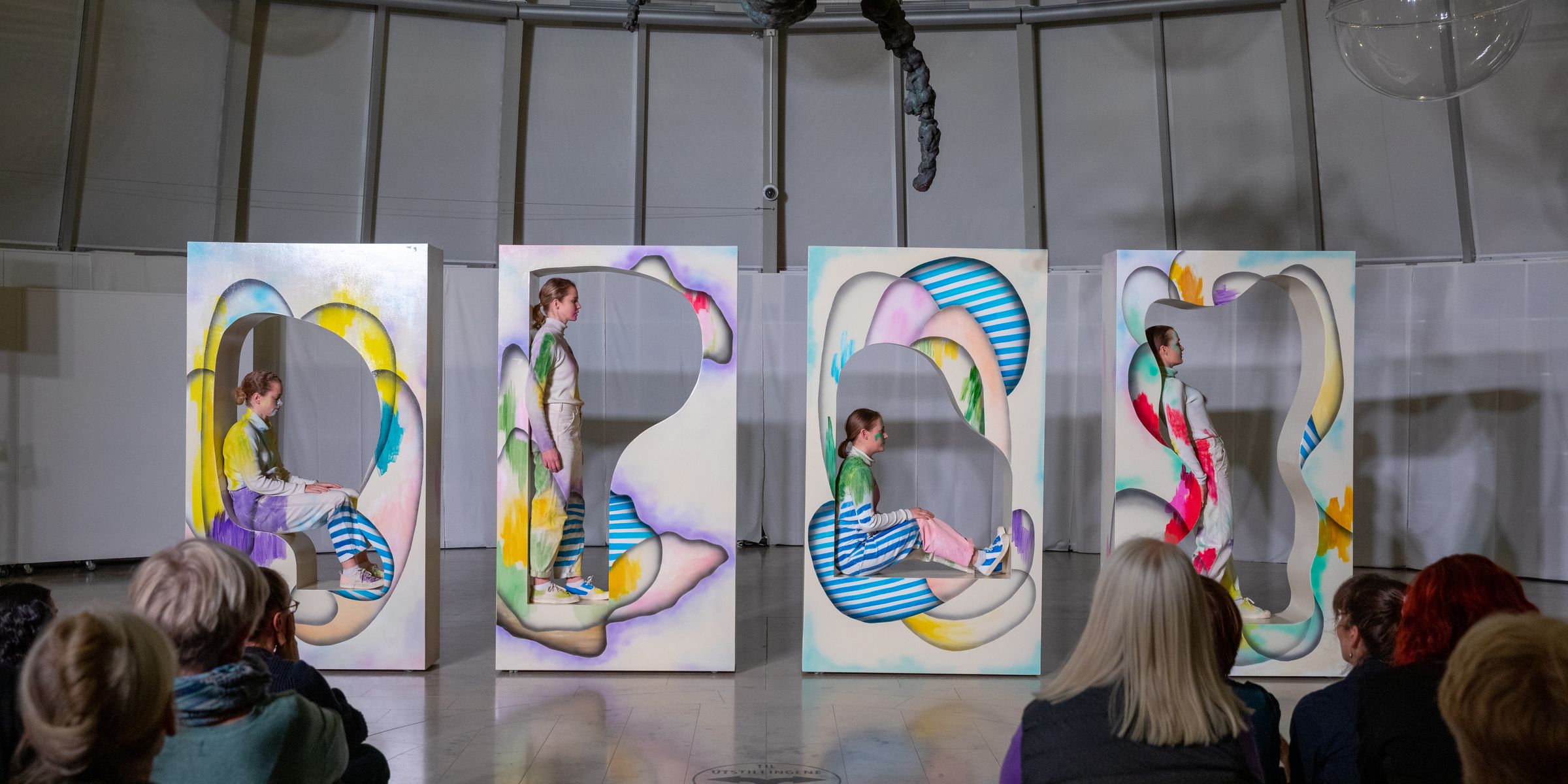 Danserne, som har løsgjort seg fra formen, tar fatt i maleriene og dreier dem rundt til oppstillingen endrer seg. Dersom mediet ikke var tvetydig før, så er det i hvert fall det nå. Det som i begynnelsen mimet en maleriopphengning har nå blitt til fire skulpturer som står i et bestemt forhold til hverandre og rommet. Baksiden av skulpturene bærer speilflater i organiske former. Hva gjør de der? Hva betyr det? Det rekker jeg ikke å tenke over i øyeblikket for musikken risler og konstellasjonen er i konstant forandring. Danserne er fremdeles delvis inne i formene og relasjonen mellom de fire skulpturene og de fire danserne testes og utforskes.