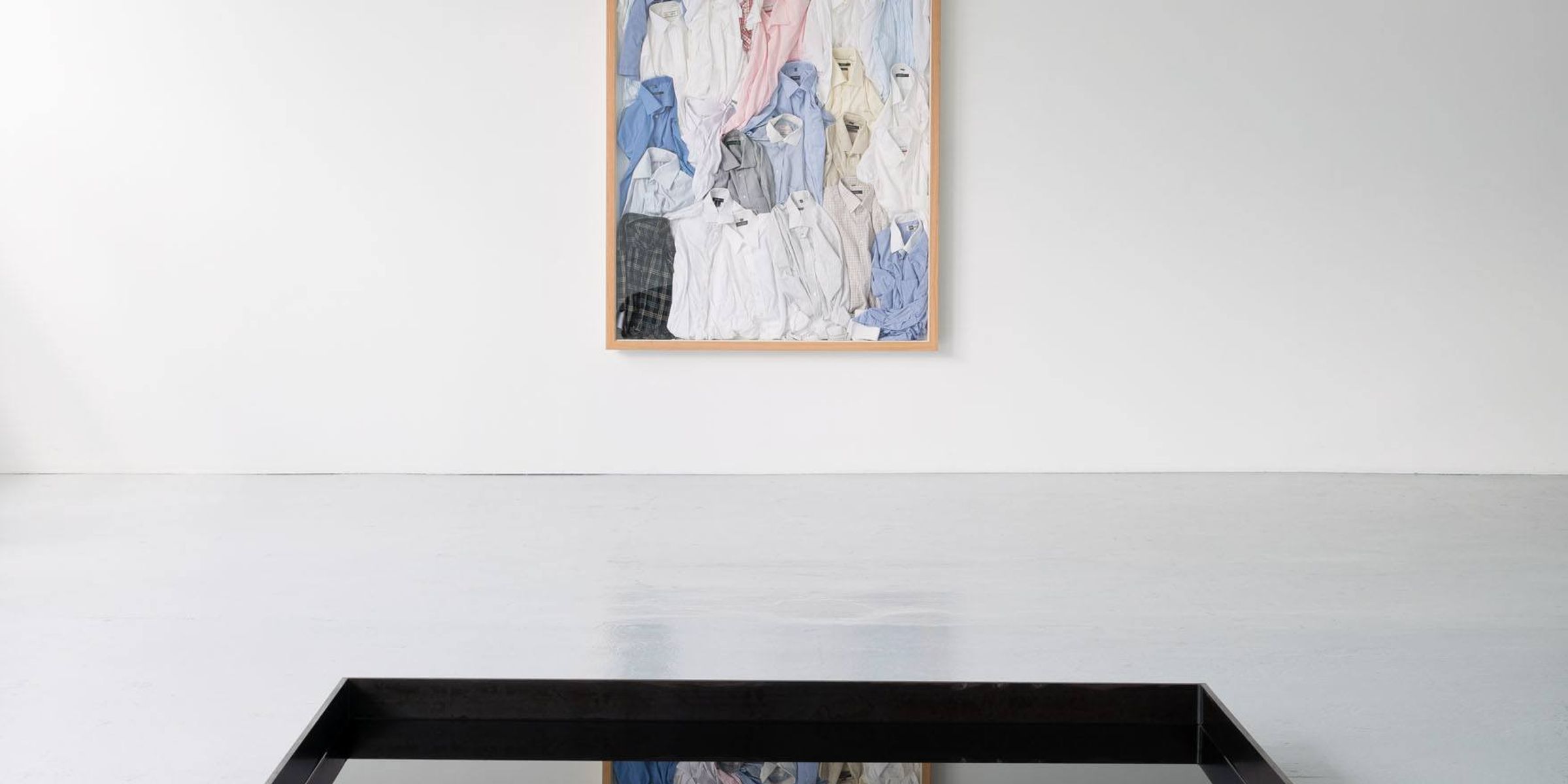 On one wall hangs a large canvas draped with menâs dress shirts, once full of life, now hanging loose and ghostly; a tactile reminder of absence. A nonsensical, hand-embroidered text articulates, in an unintelligible language, the sudden loss of communication and self-awareness. A sculptural well filled with rich, black oil, creates a fluid, darkly-reflective surface. Moldings of doors, broken windows, spectre-like architectural details seem to grow out of or be subsumed by organic forms of foam and concrete, creating a true construction of interiority.
