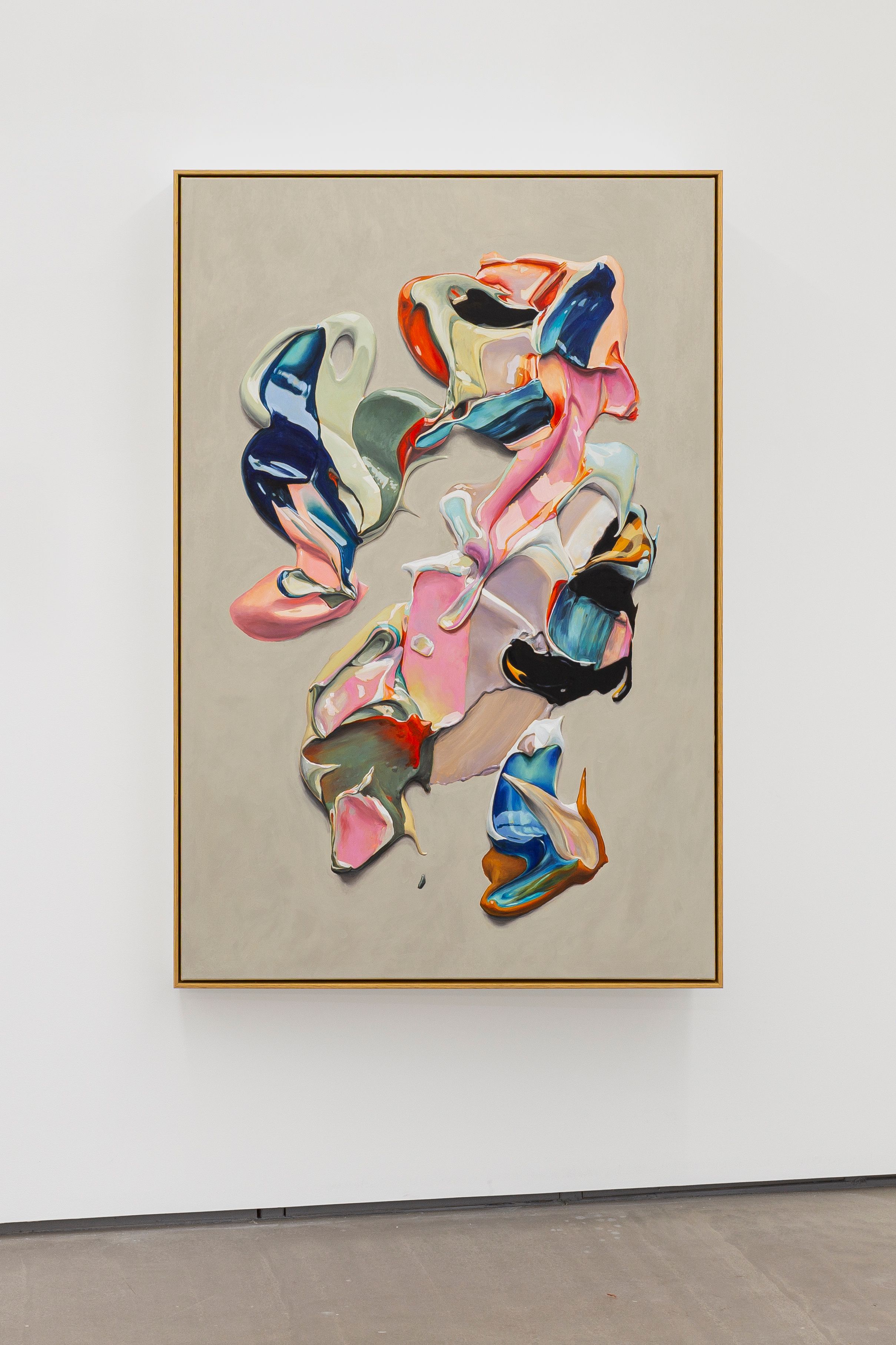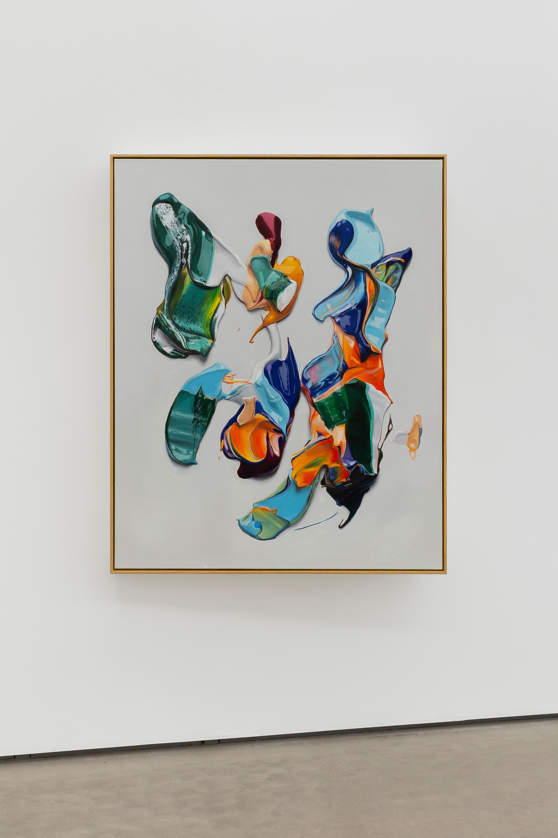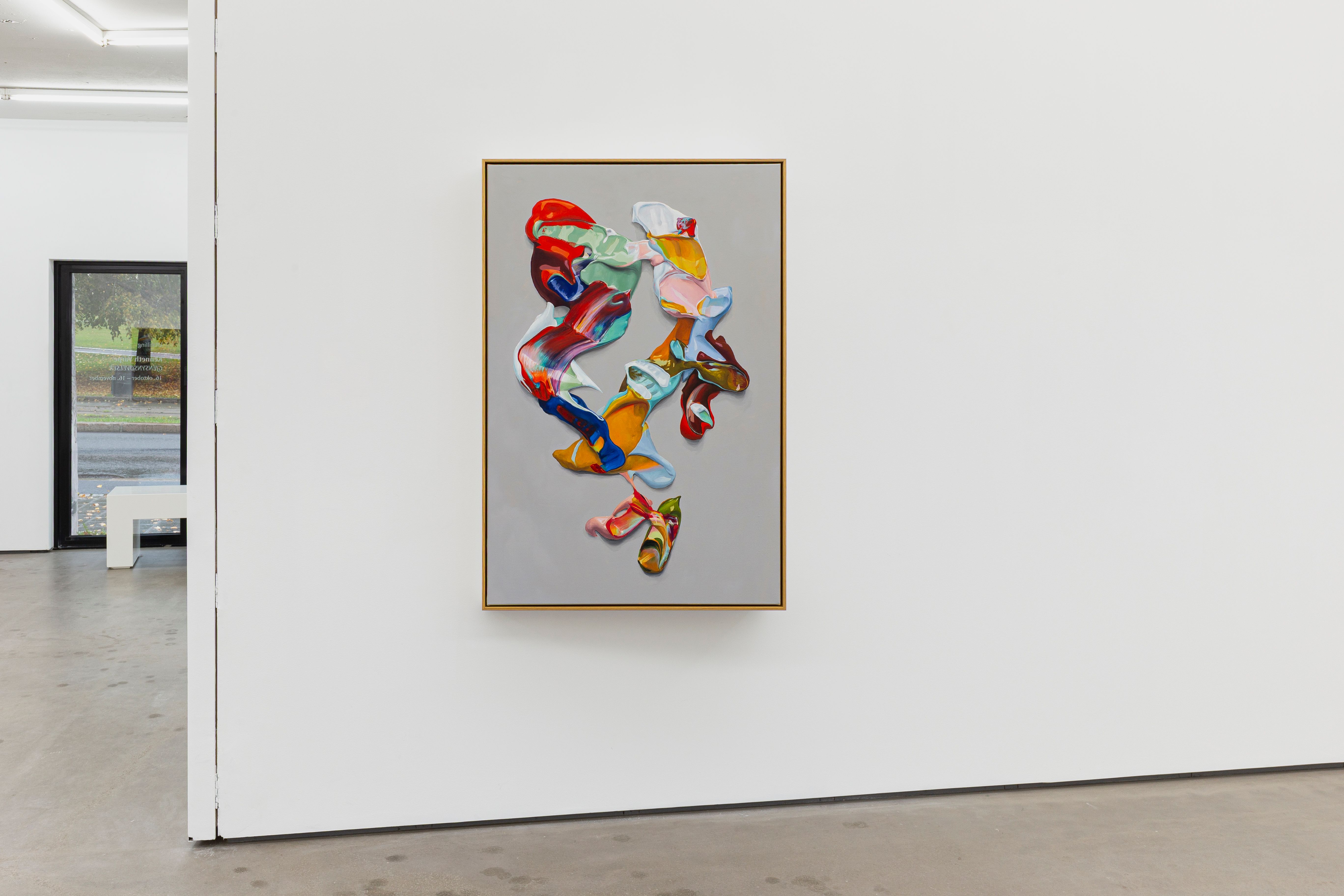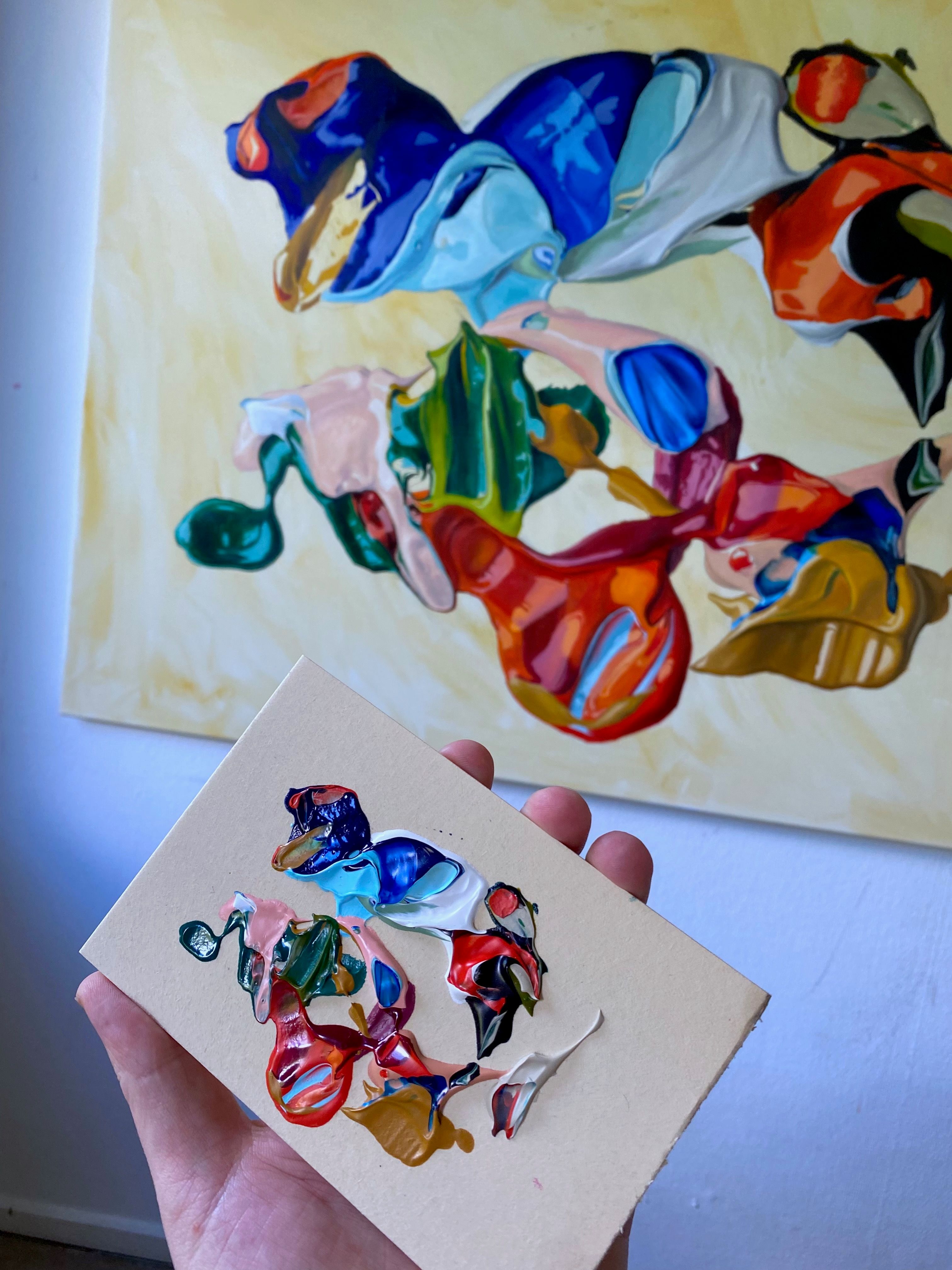 The paintings on display here are made using a method that Varpe has been fine-tuning for years, and he considers them a continuation of this much larger body of painting. It involves a swift, almost automatic laying down of blobs of mixed and unmixed paint in generous, viscous layers onto small-scale pieces of board (he refers to them as ‘the miniatures’). The immediacy of these miniature compositions is of importance to Varpe, as a kind of gearing up to what follows, which is conversely a much longer process of a slowed down, curious, and particularly attentive form of looking. He says that a miniature is produced in 10 seconds, while a month is spent on each painted ‘copy.’ Out of all the miniatures produced in one sitting, he selects a small number that he stages for photography, paying special attention to the topographies of the painted surface, which he enhances with light and shadow.