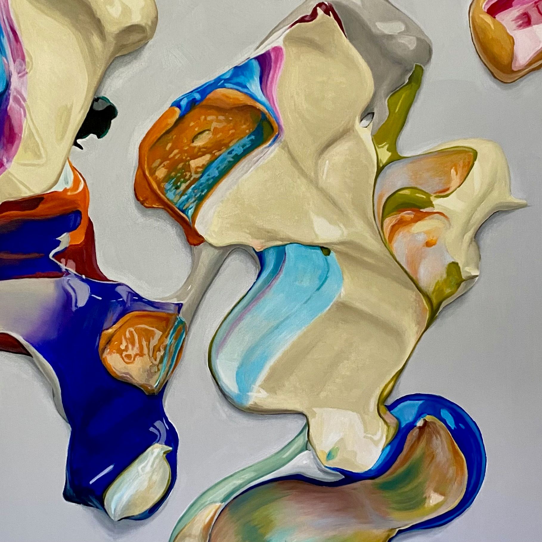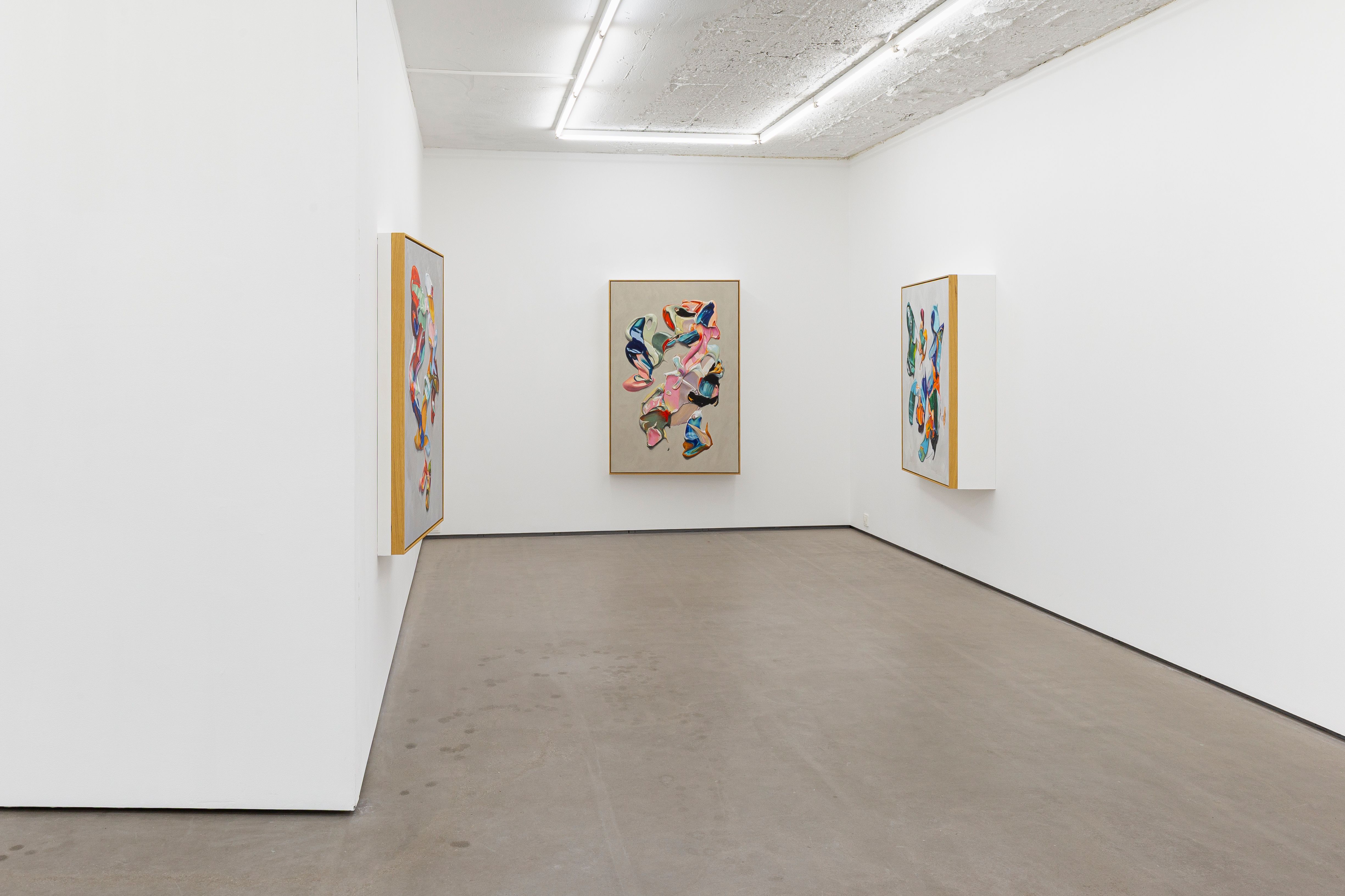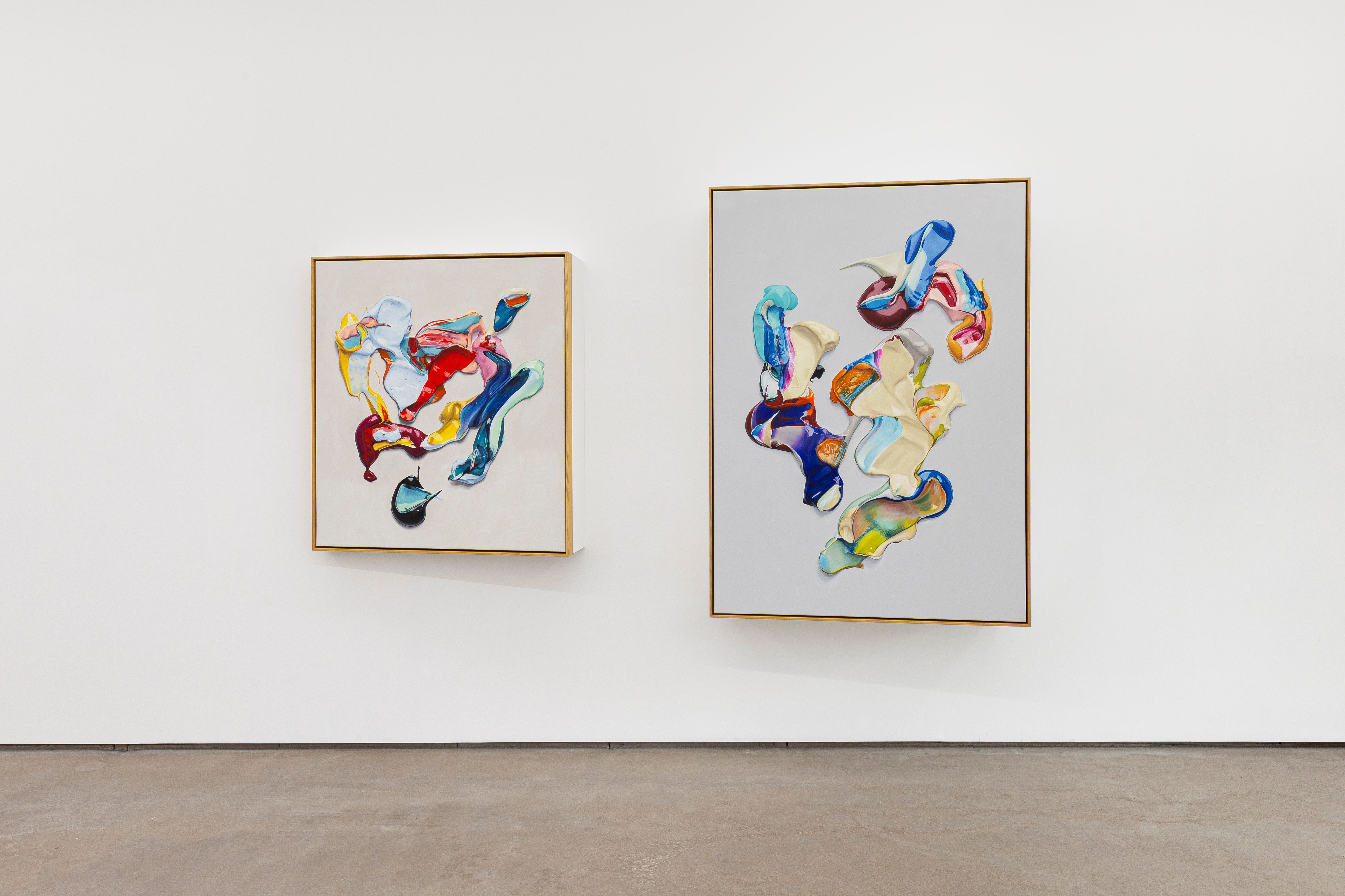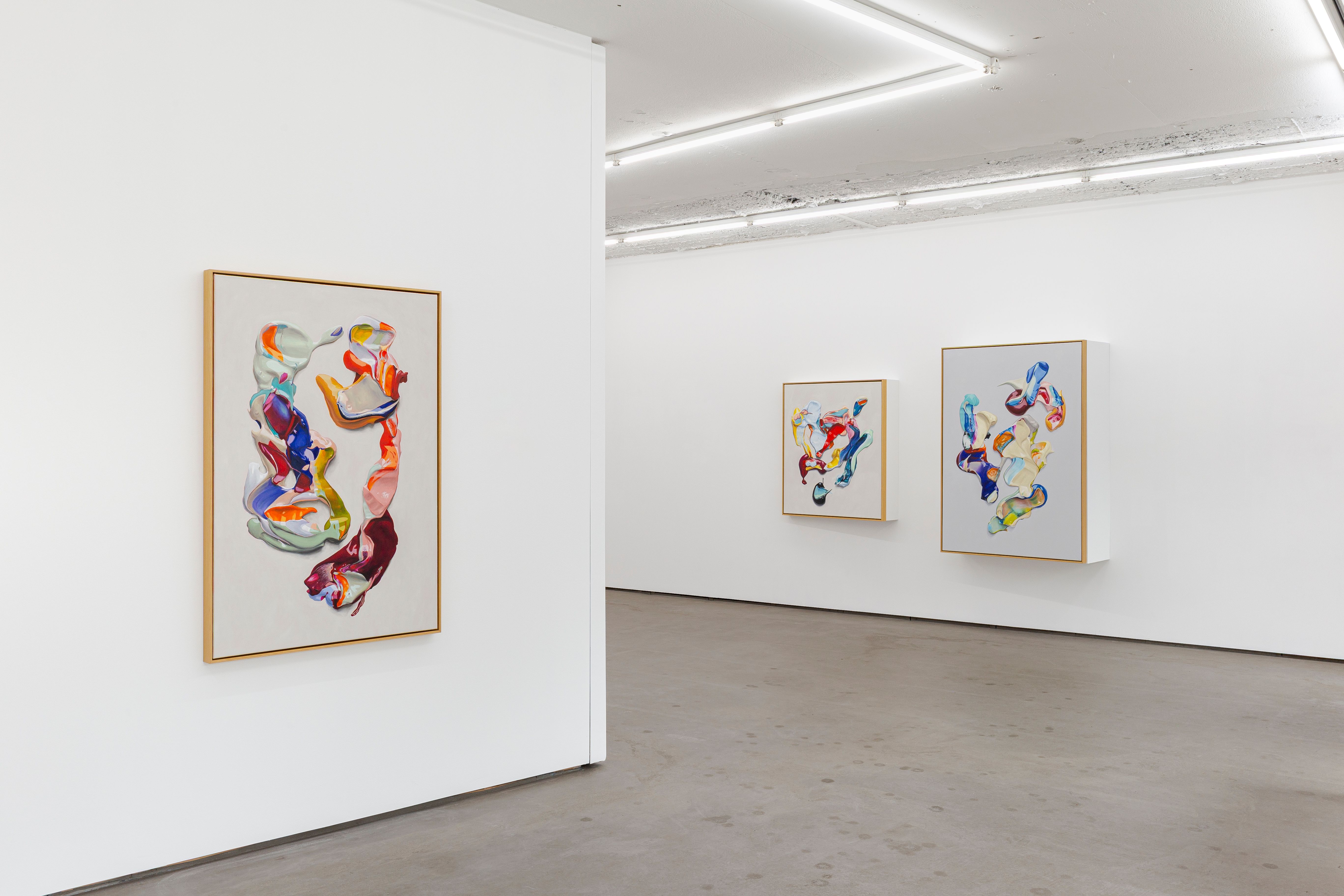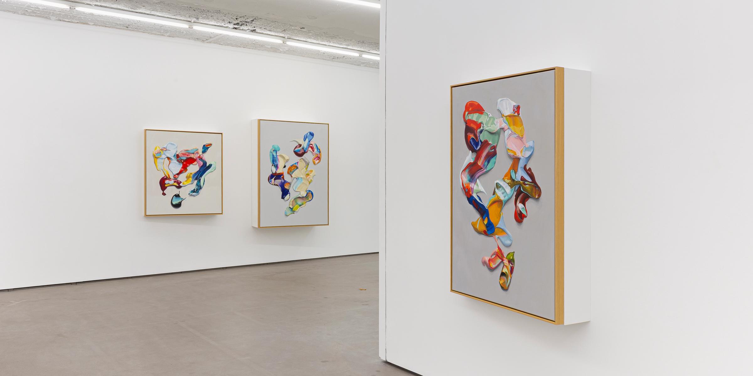 The paintings on display here are made using a method that Varpe has been fine-tuning for years, and he considers them a continuation of this much larger body of painting. It involves a swift, almost automatic laying down of blobs of mixed and unmixed paint in generous, viscous layers onto small-scale pieces of board (he refers to them as ‘the miniatures’). The immediacy of these miniature compositions is of importance to Varpe, as a kind of gearing up to what follows, which is conversely a much longer process of a slowed down, curious, and particularly attentive form of looking. He says that a miniature is produced in 10 seconds, while a month is spent on each painted ‘copy.’ Out of all the miniatures produced in one sitting, he selects a small number that he stages for photography, paying special attention to the topographies of the painted surface, which he enhances with light and shadow.