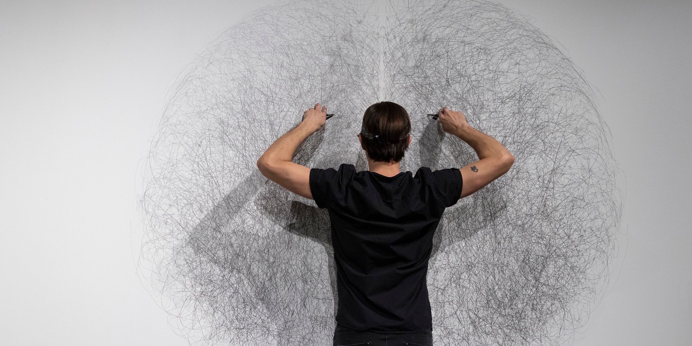 Den hvite veggen som utgjĂžr lerretet er plassert midt i salen, og med baksiden mot publikumsinngangen. Man mĂ„ altsĂ„ krysse âscenenâ eller gulvet hvor kunstneren arbeider for Ă„ finne sin plass pĂ„ benkeraden eller puter pĂ„ forlengelsen av gulvet. Dette enkle lille grepet alene utfordrer det dannede publikum og enkelt og effektivt bryter det ned et eventuelt konstruert skille mellom kunstner-scene- publikum/betrakter. Man blir delaktig i det som foregĂ„r som i en immersiv performance. Rommet er likevel ganske stille, og nĂŠrmest andektig som om publikum holder pusten for Ă„ ikke forstyrre, fĂžr en etterhvert lar seg henfĂžre og lever seg inn i det hele. Alt foregĂ„r i stillhet. Det er tilsynelatende ingen annen lyd utover raslingen av de to blyantenes dans over billedflaten og kunstnerens pust, som tidvis oppleves som et anstrengelsesutlĂžst, nĂŠrmest rytmisk lydspor.