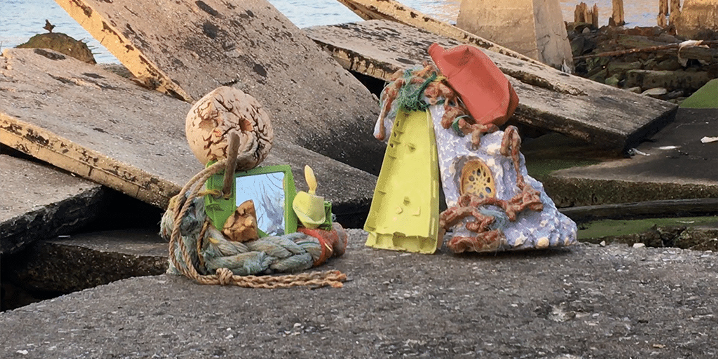 The last element was a lighting installation sourced locally in Stavangerâ a collection of lamps of various sizes found at thrift stores. I hate overhead lighting in my life, so I decided that I don't want art I make to be displayed in a gallery with anything but beautify diffused lamp light. The lamps were arranged in a sculptural cluster that both puts the viewer off-kilter in a subtle way and suggests a kind of anthropomorphism of the lamps, bringing them to life in a small way. That spark of life links all three bodies of work in the show, all of the which contains discarded human-made objects which have a range from ambiguous kinda-feels-alive to explicitly animated life forms.
