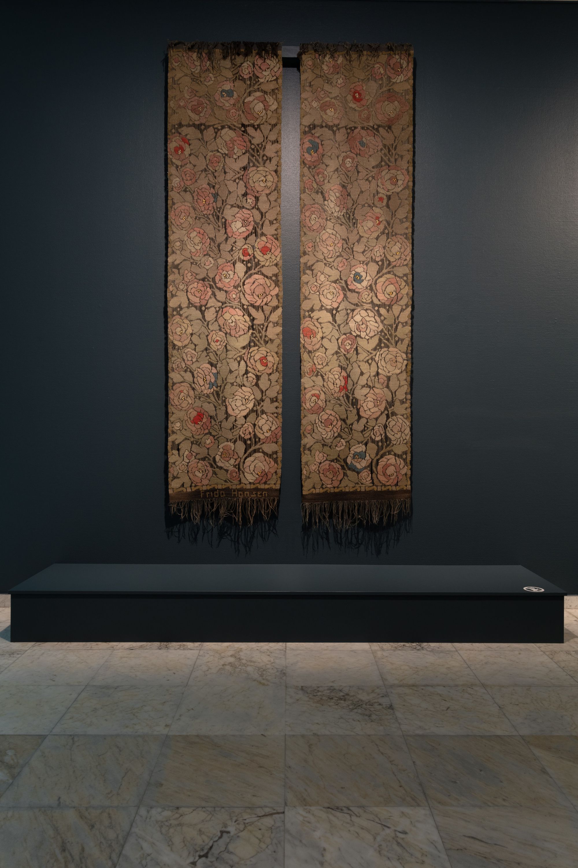 Hansen's work Peoner is a perfect example of a practical artwork that invites us to touch and engage with it. This brings me back to the word portiere, which is typically defined as a curtain hanging in front of a doorway. Peoner is a portiere made up of two delicate, partially transparent woven panels depicting peonies. At the museum they are presented flat against the wall, but they were never intended to be shown in this way. They were supposed to hang in a doorway like a portal that lets light, movement and sound from one space into another while at the same time dividing the spaces. They were made to be looked at, looked through, and also to be passed through, letting the soft woven threads move across your skin and body. It's truly an artwork for all the senses. The museum has to protect these old and fragile works from both touch and light in an effort to conserve them for the future. And I do understand that it's the museums job to do so, but in a sense, through the action of conservation, the true meaning of the work is taken away.