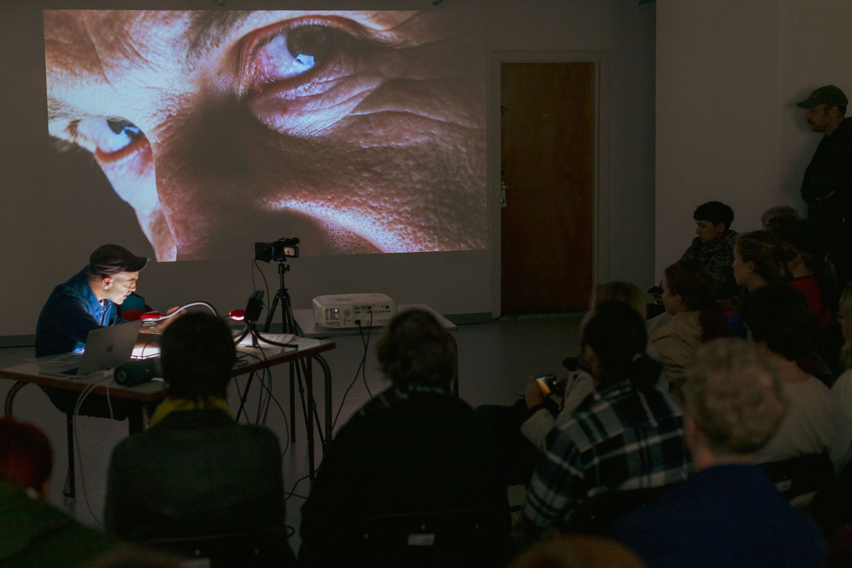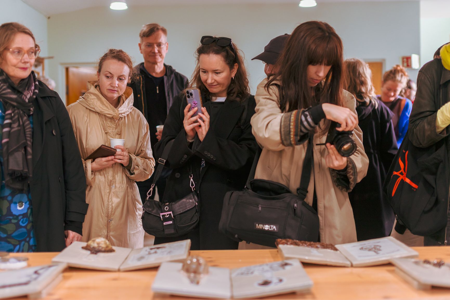 Participants photograph Marte Jonslien's art work Descend and Dwell after her reading. Photo: Carlos H. Juica