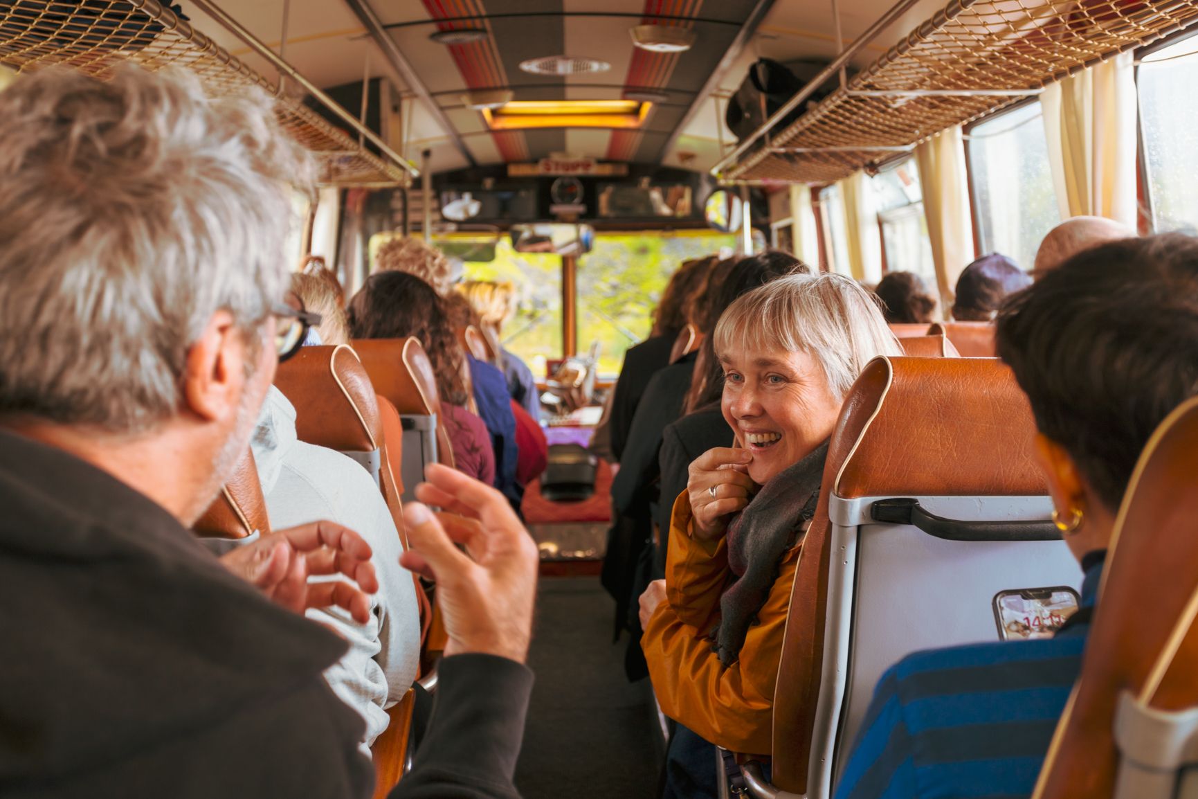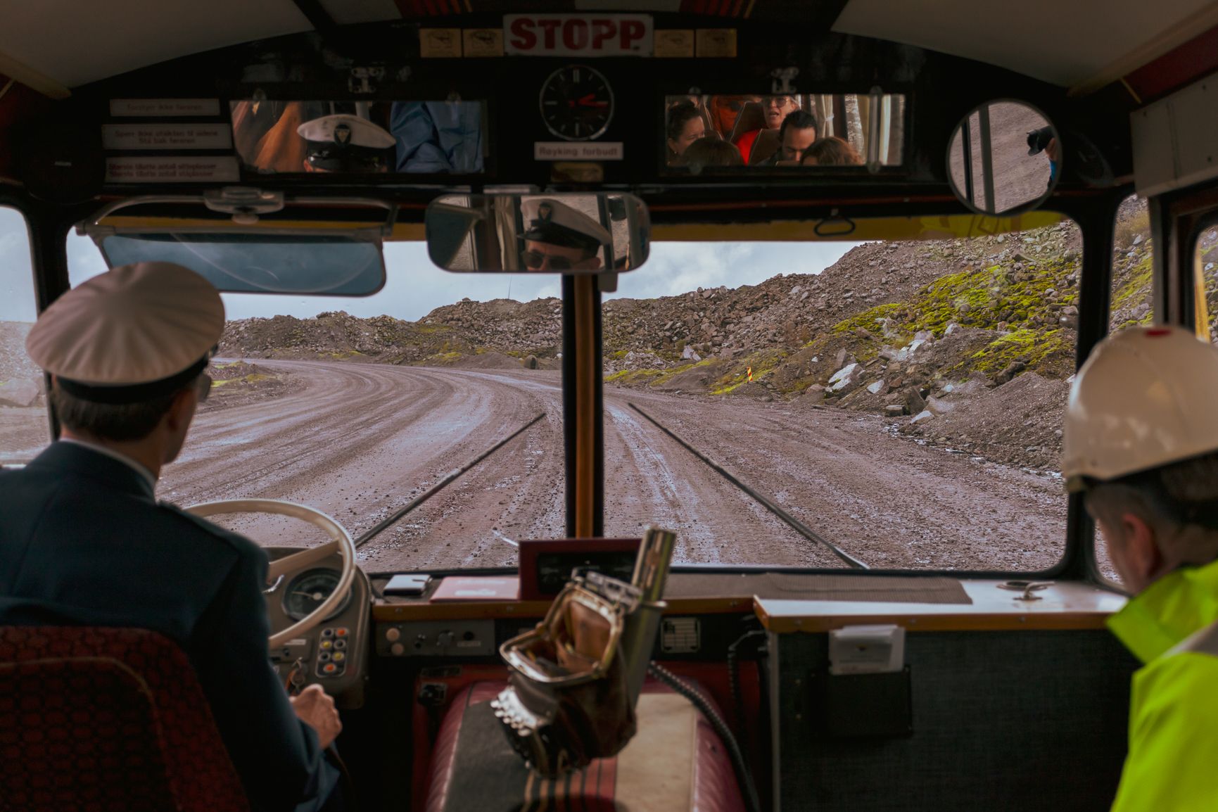 The bus driver and guide look at the road ahead during the visit to the mine. Photo: Carlos H. Juica