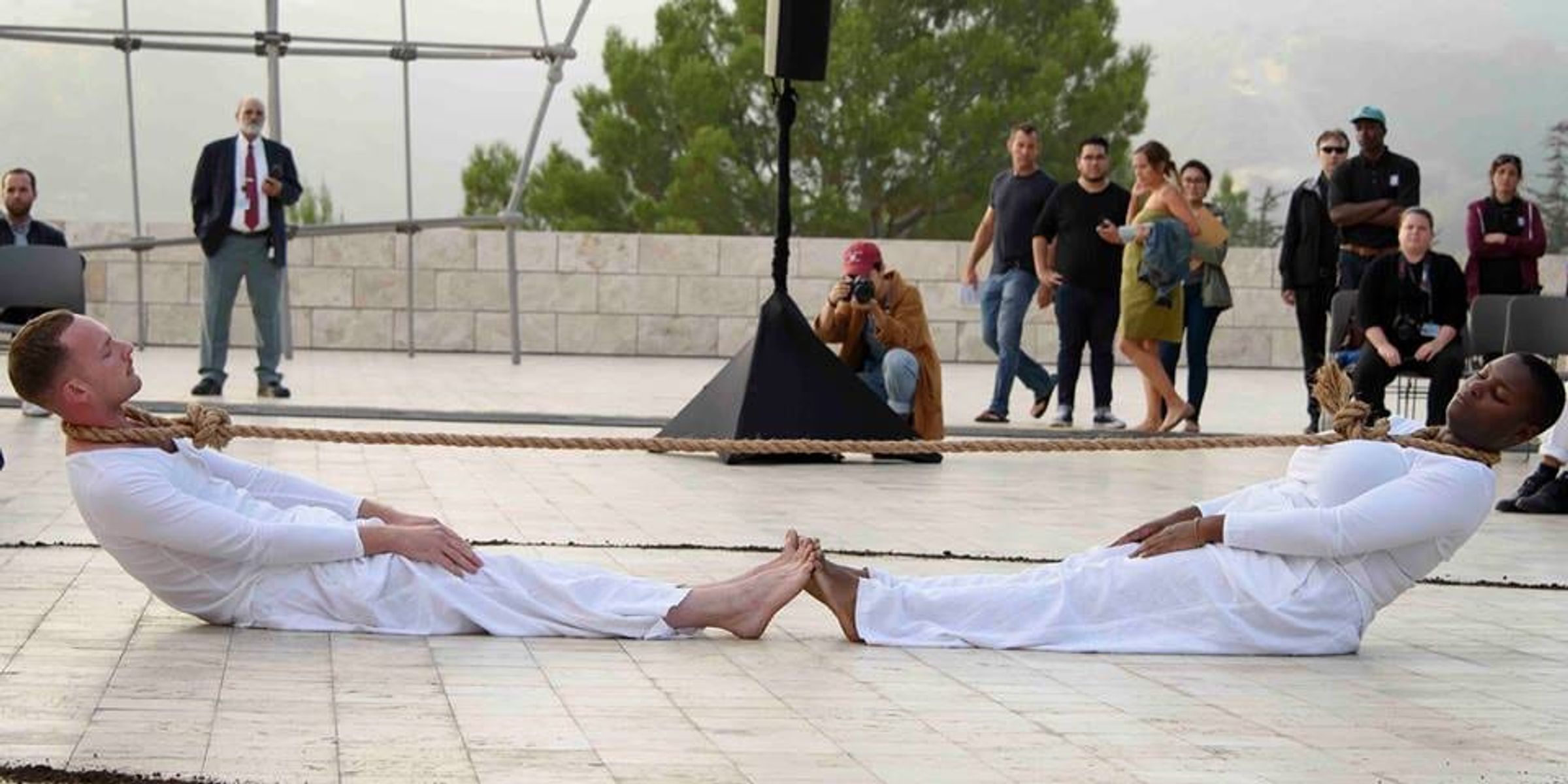 My decision to perform this piece with Kenyatta is not about becoming a hero, rather it is about confronting my shame. I donât write this with a sense of self-importance or to impress for accolades. I do not seek applause. Rather I ask myself: If I am forced to look at my friend Kenyatta with a noose around her neck while I feel that same rope tighten around my own, what do I have to learn? What does this relation offer an audience? What this performance tragically illustrates is the inability to untether the effects of centuries of racial oppression and violence from my peaceful, loving, caring relationship with Kenyatta as a friend, co-teacher, and artistic collaborator. This realization, while difficult to look in the face, humanizes our interaction - it acknowledges the inherent violence of racial construction and the impossibility of us getting out of this mess by using the same tools with which it is built and maintained. As long as white people maintain the noose of racism, the noose, too, will remain around their own necks.