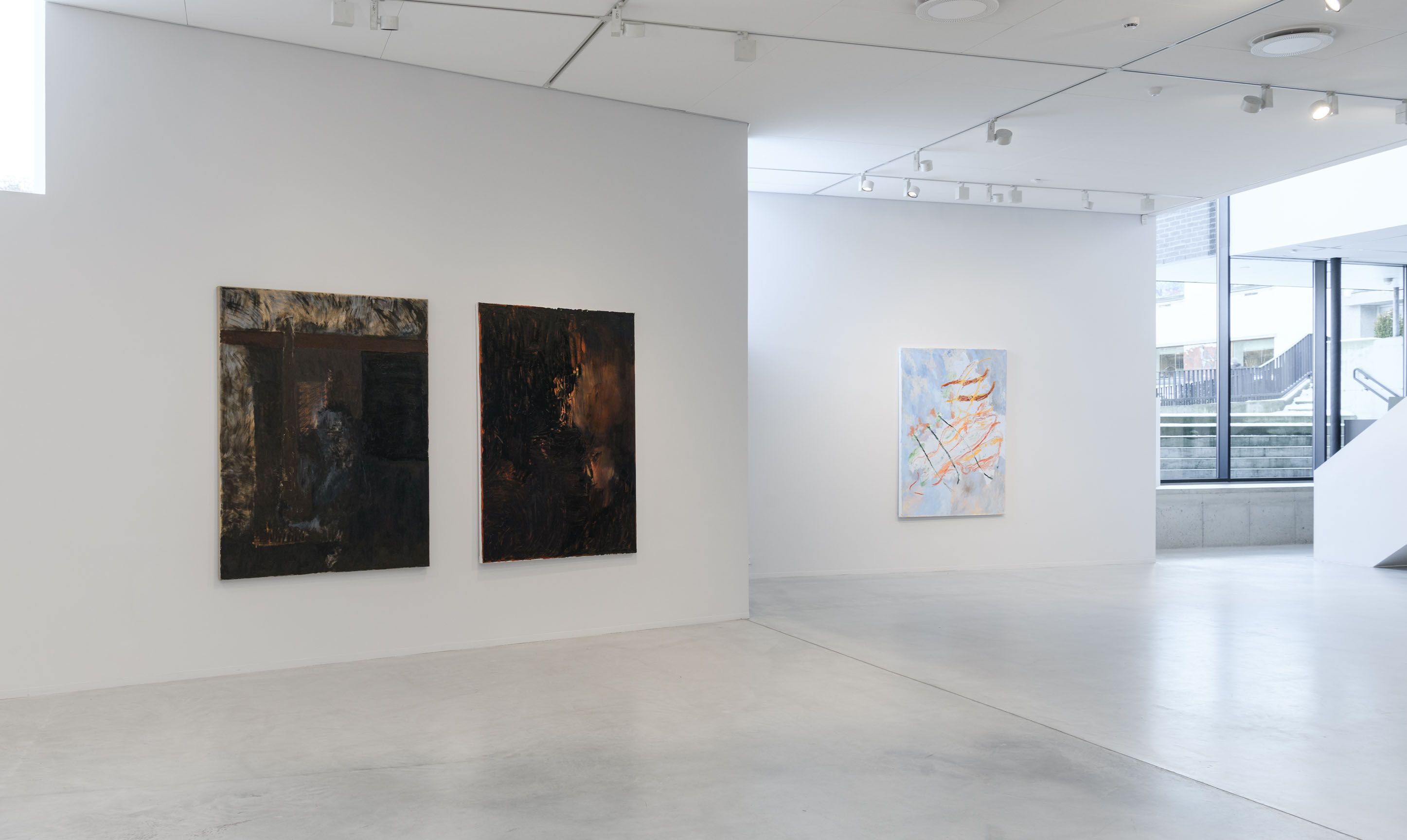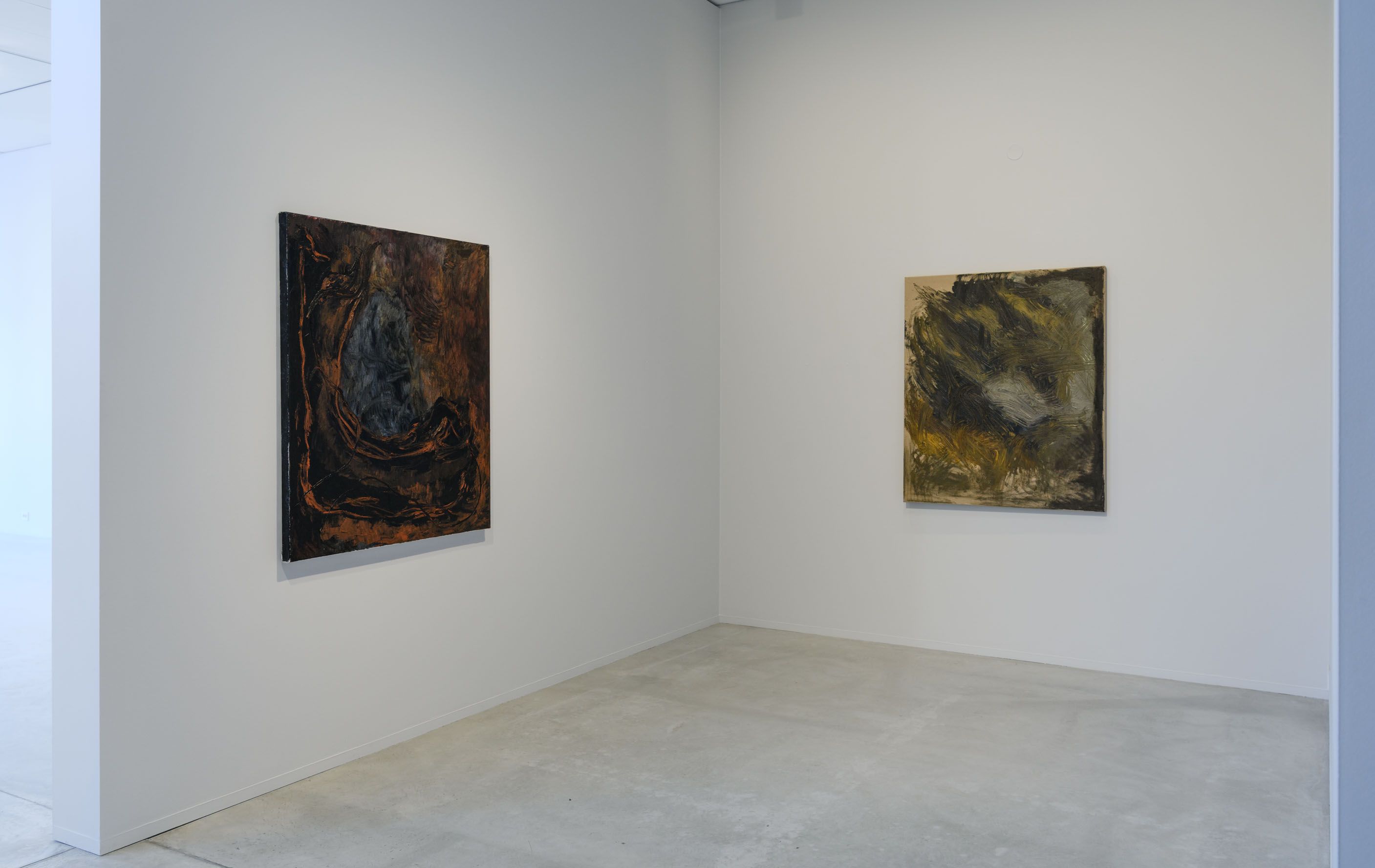 Utstillingen rommer også en mørkere pol. I flere av maleriene trekkes betrakteren inn i dype, nesten sugende rom. Her er fargepaletten tettere, jordfargene mørkere og gestikken mer eksplisitt. Malingen er bearbeidet hurtig, nesten voldsomt. Sporene etter verktøy, fingre og håndbevegelser er godt synlige. De er direkte bevis på at kroppen har vært i kontakt med flaten. Avleiringer og trykk vitner om en fysisk prosess. Det “lille” maleriet Uten tittel (110 x 130 cm) er et slikt eksempel, hvor hver bevegelse og aksjon kan spores. Riktignok handler min umiddelbare begeistring for akkurat dette maleriet i større grad om nettopp denne bakenforliggende prosessen og taktiliteten, og i mindre grad det komplette verket.