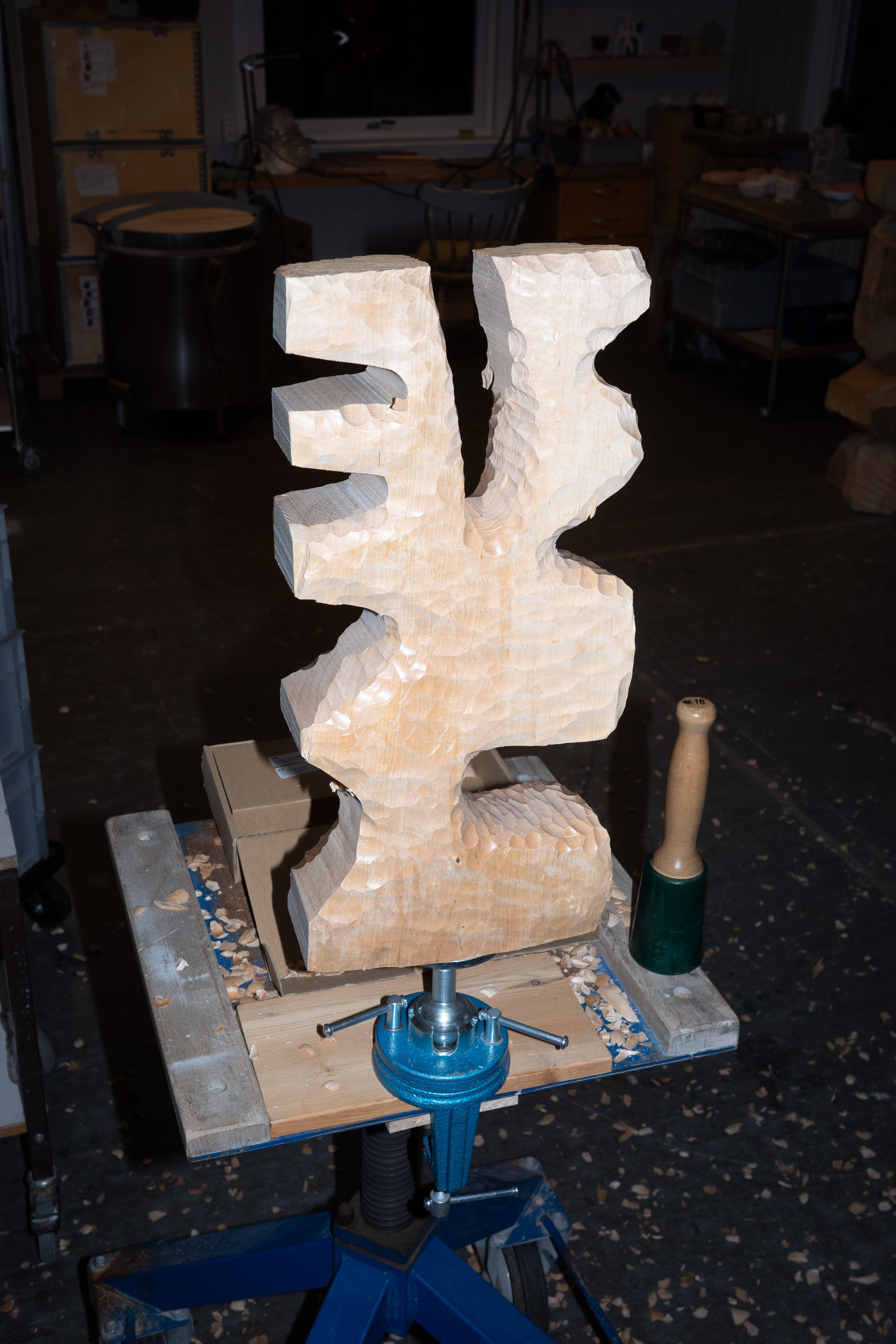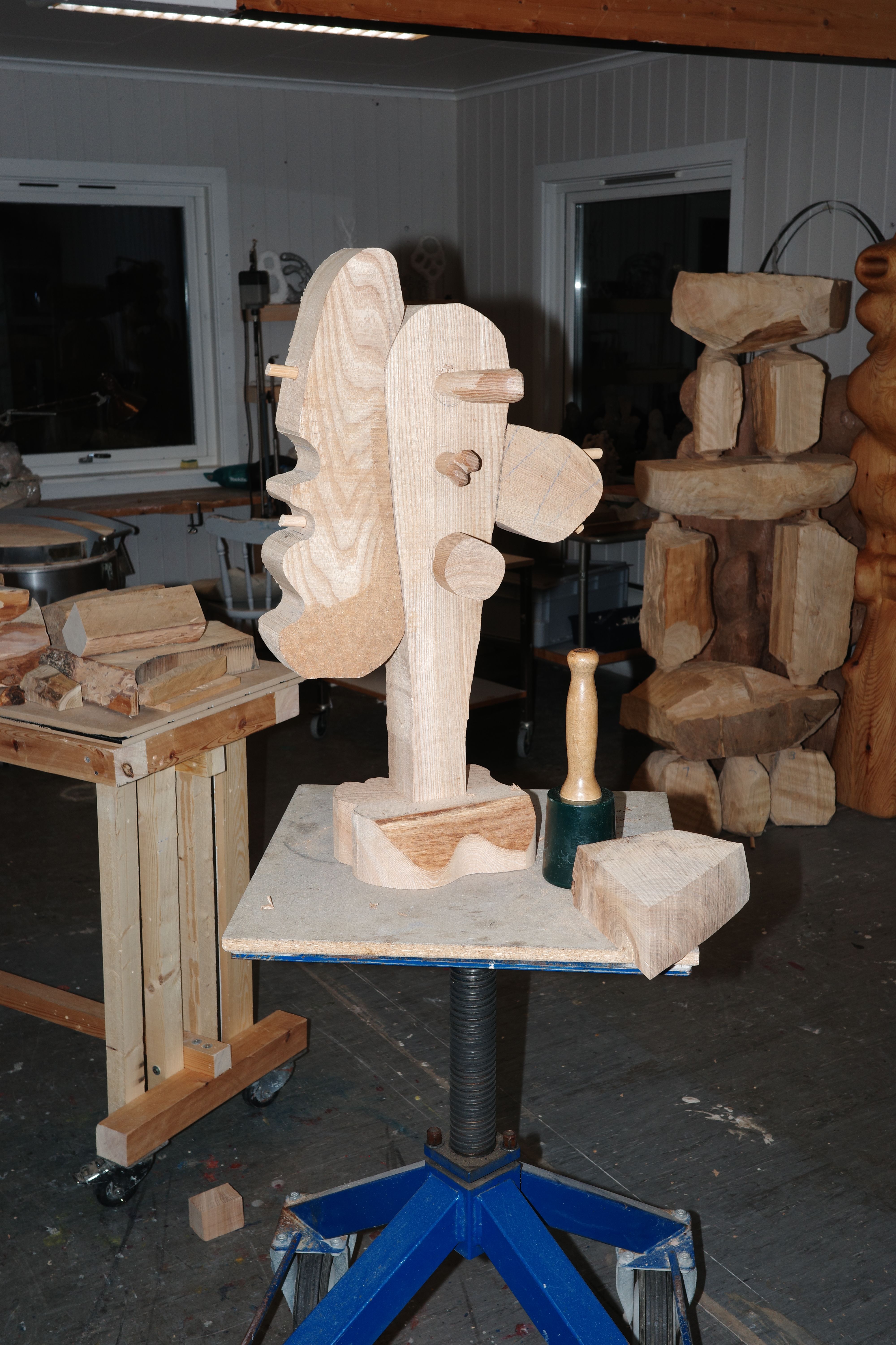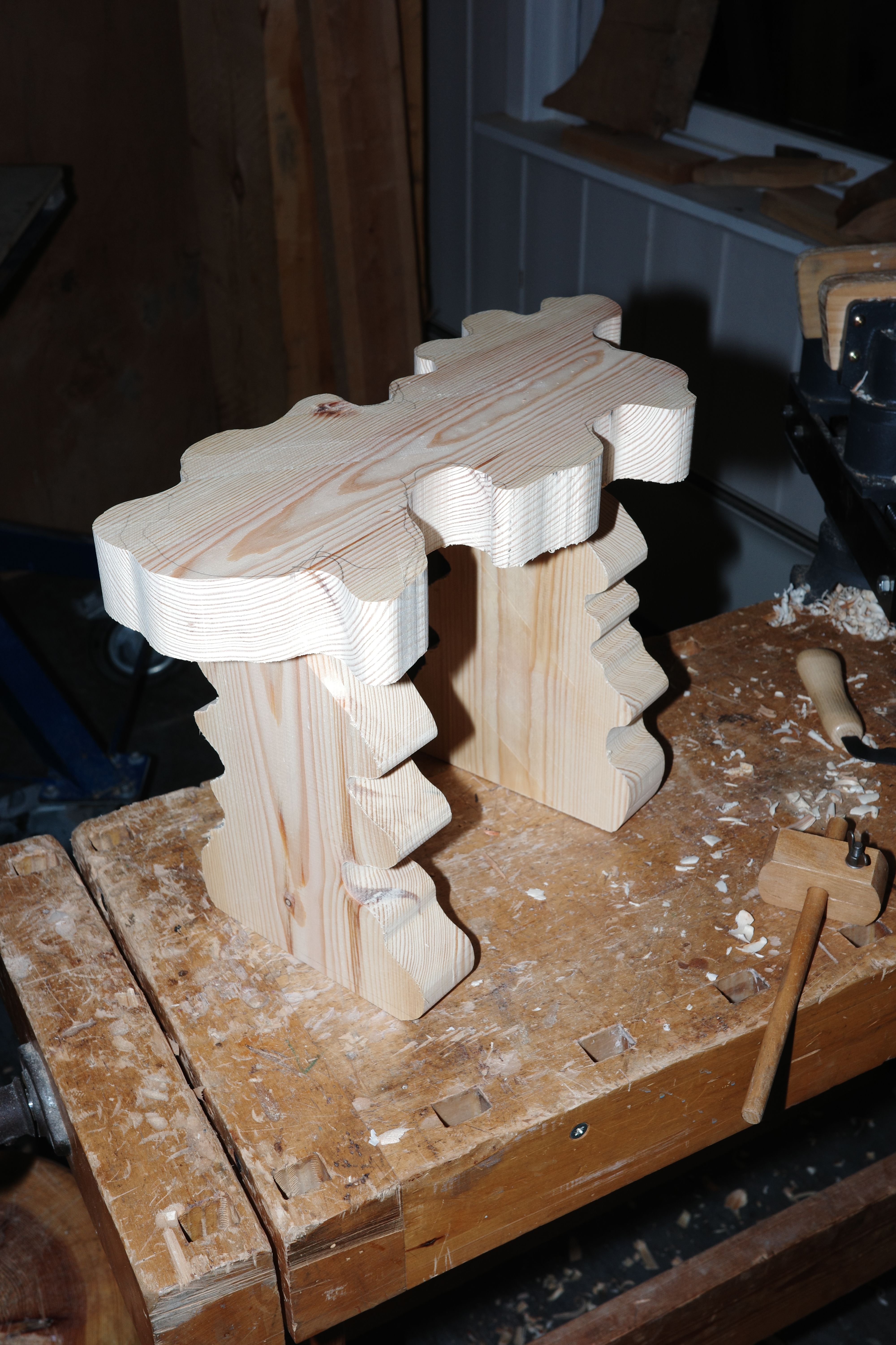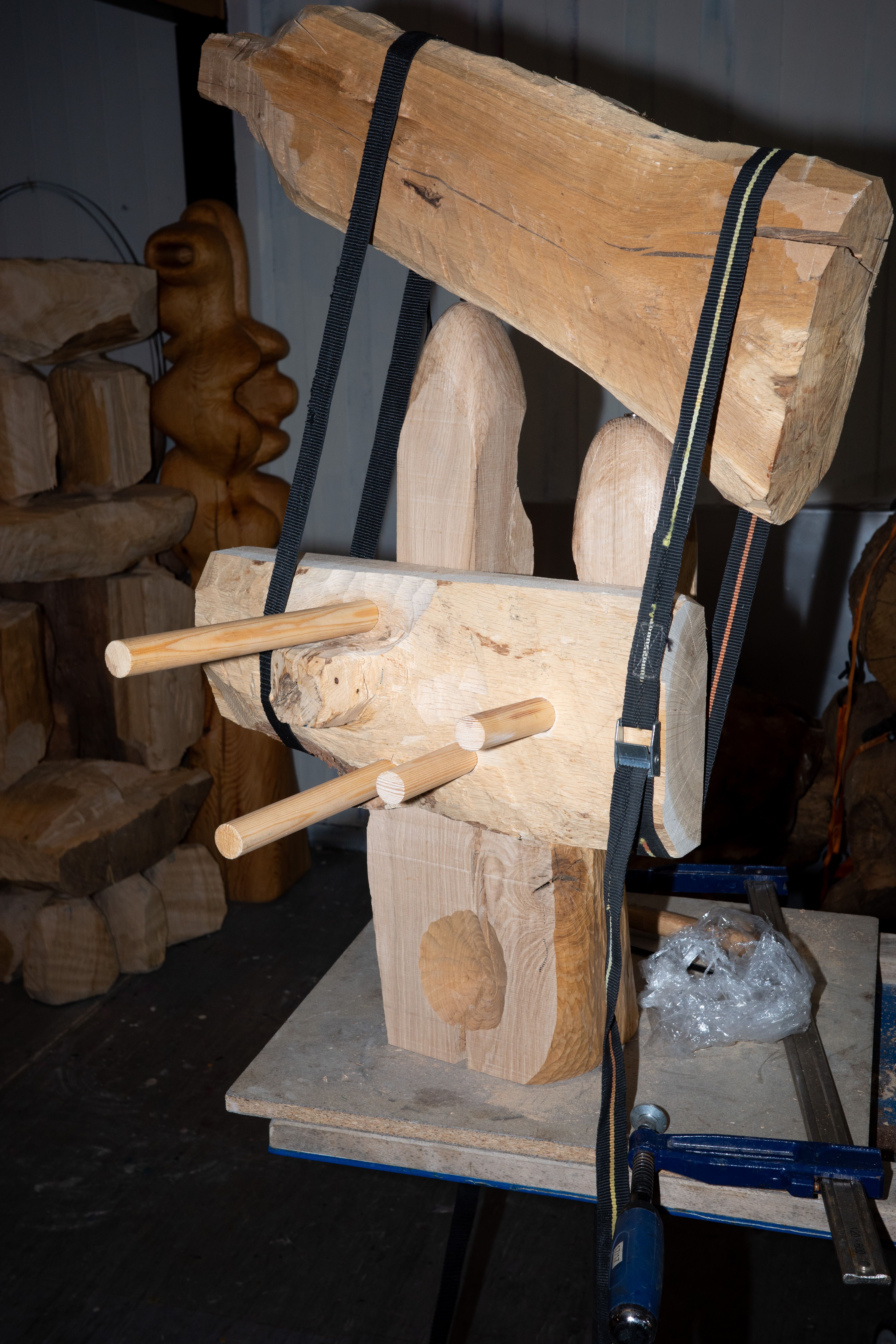 Today I was cleaning out the workshop. It used to be an old kindergarten, so there is a lot of furniture and other things from that time that needed to be taken to the second-hand shop. I used my scriber to transfer the shape of the two standing forms onto the top piece of wood. The transport straps worked well to temporarily fix the piece in position so I could scribe a pencil line. I then used this line as a guide for where to carve away material. For this sculpture, I used a lot of pine tenons to fix the different parts together.