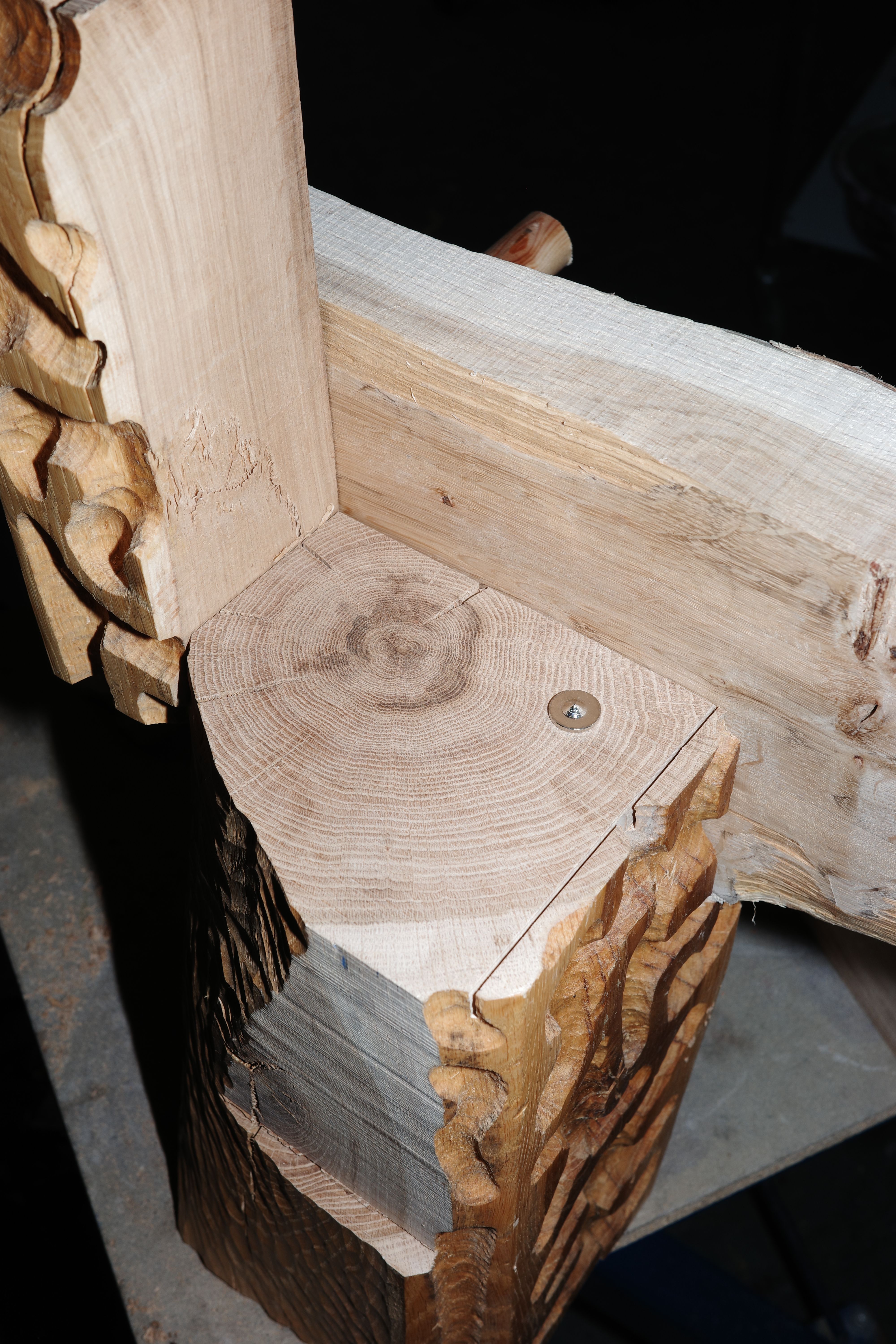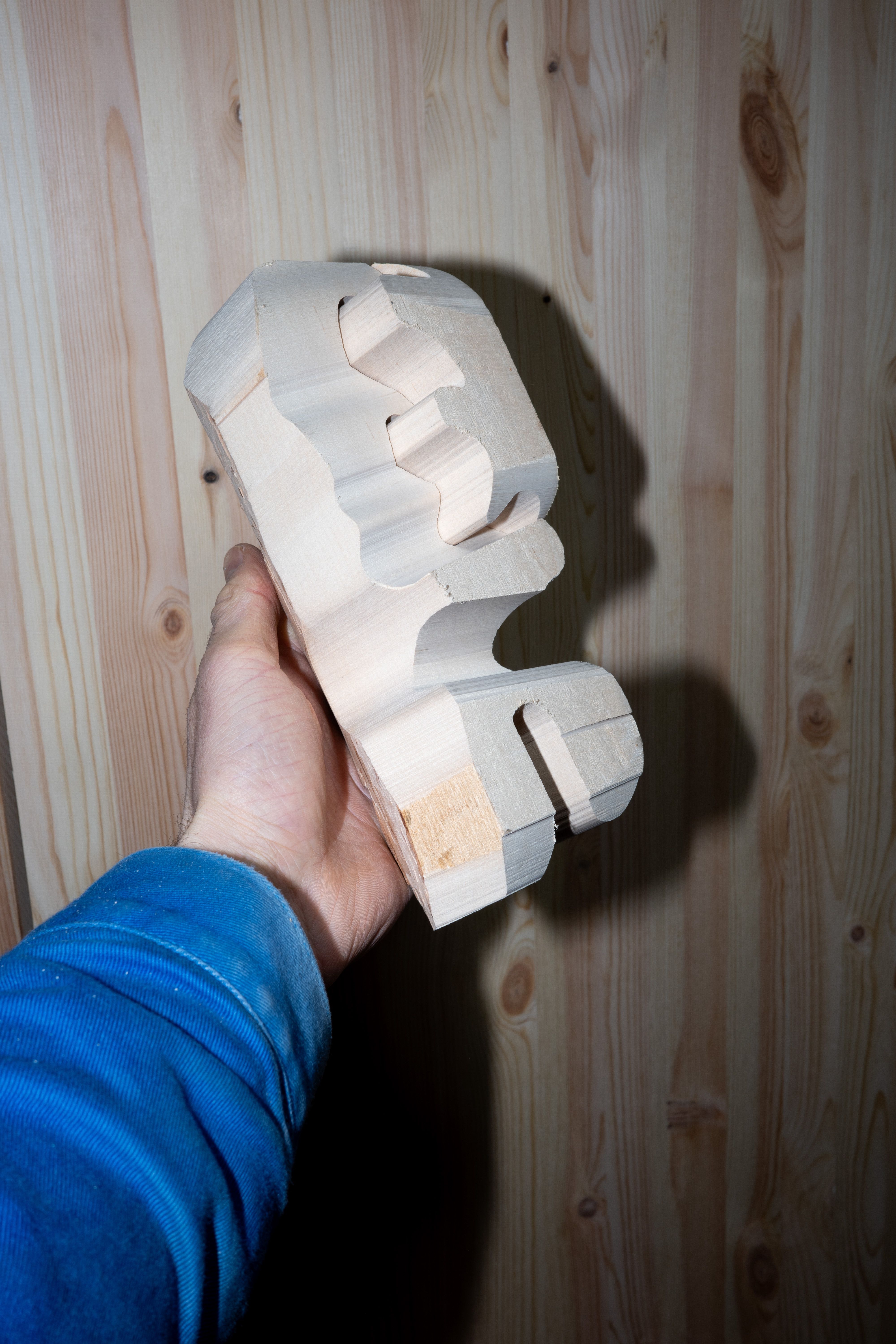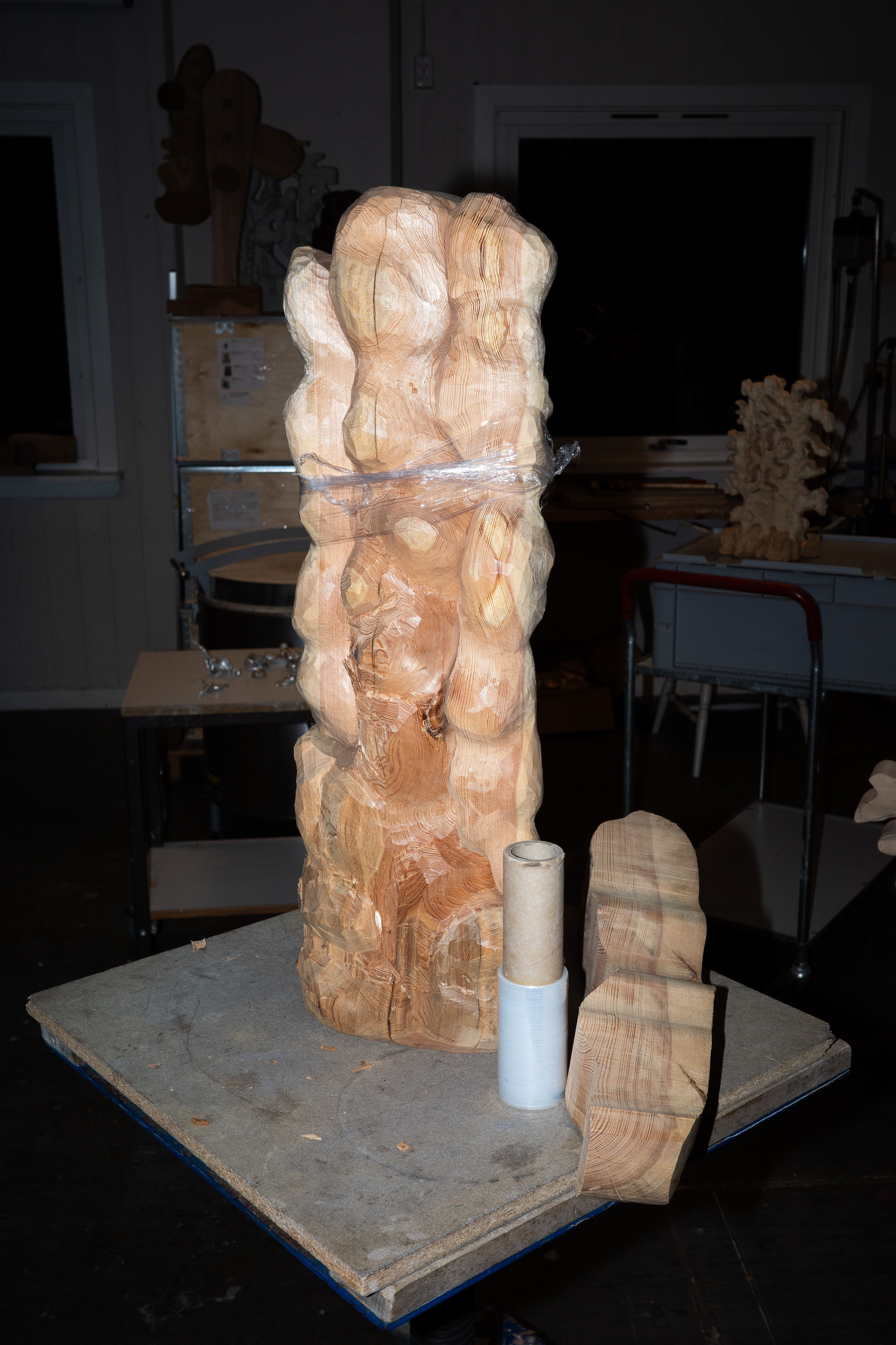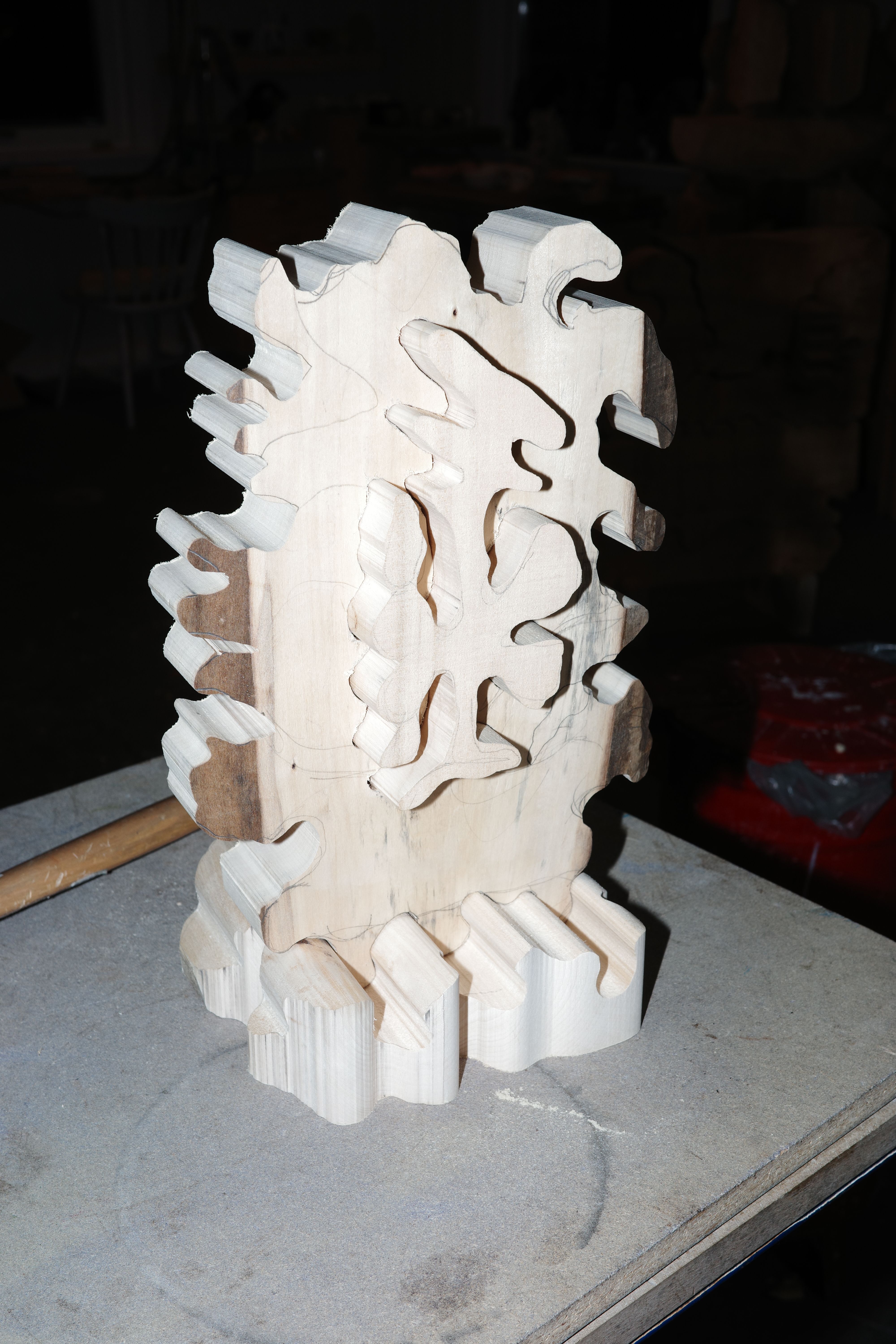 Today I was cleaning out the workshop. It used to be an old kindergarten, so there is a lot of furniture and other things from that time that needed to be taken to the second-hand shop. I used my scriber to transfer the shape of the two standing forms onto the top piece of wood. The transport straps worked well to temporarily fix the piece in position so I could scribe a pencil line. I then used this line as a guide for where to carve away material. For this sculpture, I used a lot of pine tenons to fix the different parts together.