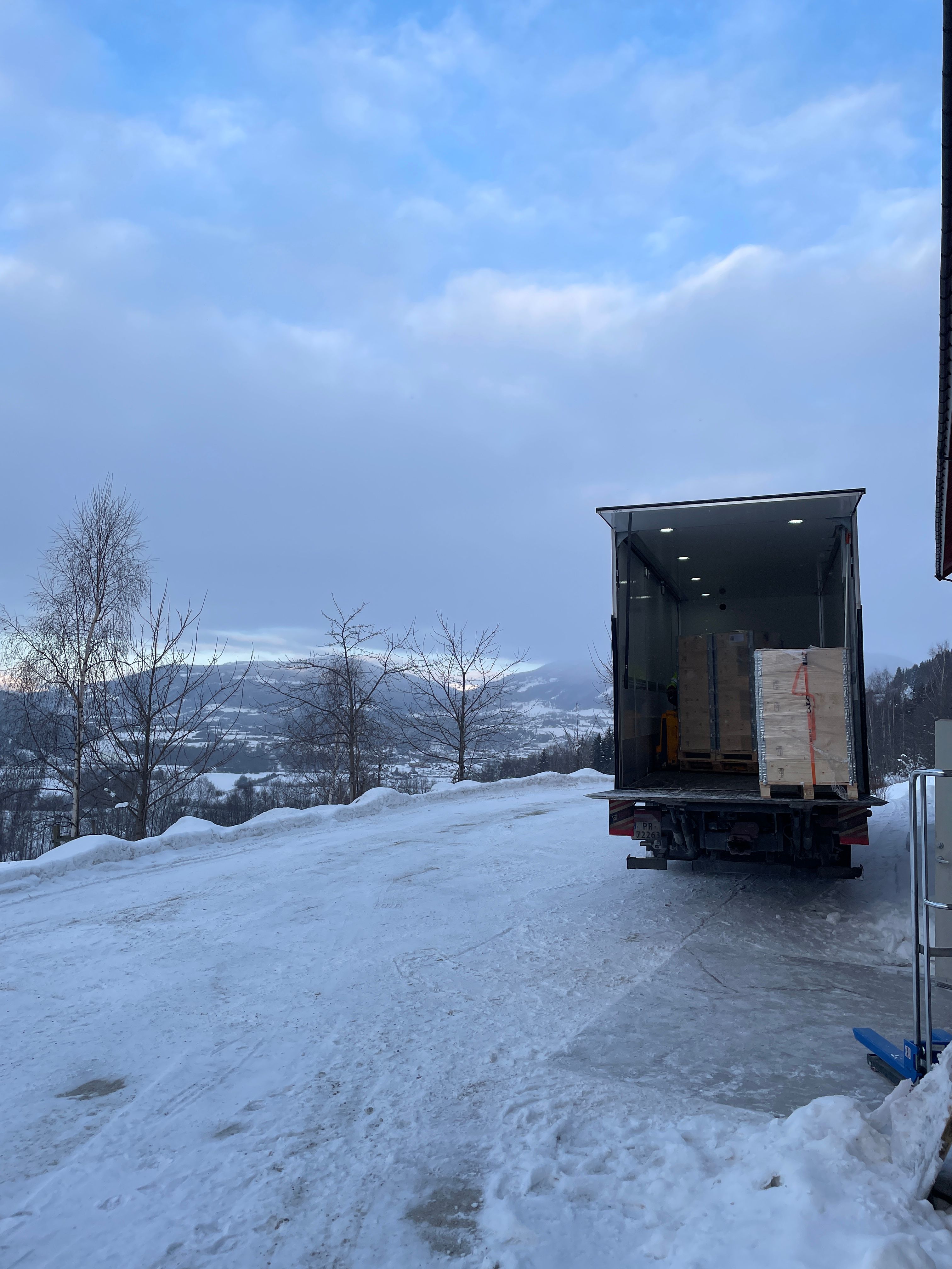 Last day. Loading the truck going to Stavanger and Galleri Opdahl with 17 half pallets and two regular euro pallets, all strapped up with pallet frames and plywood lids. Foiled as an extra safety, and for dust and water protection. Very tricky conditions for the truck, which had to put chains on to get up the icy hill with a U-turn in it. Thanks to Senter for Keramisk Kunst. Now driving back to the south.