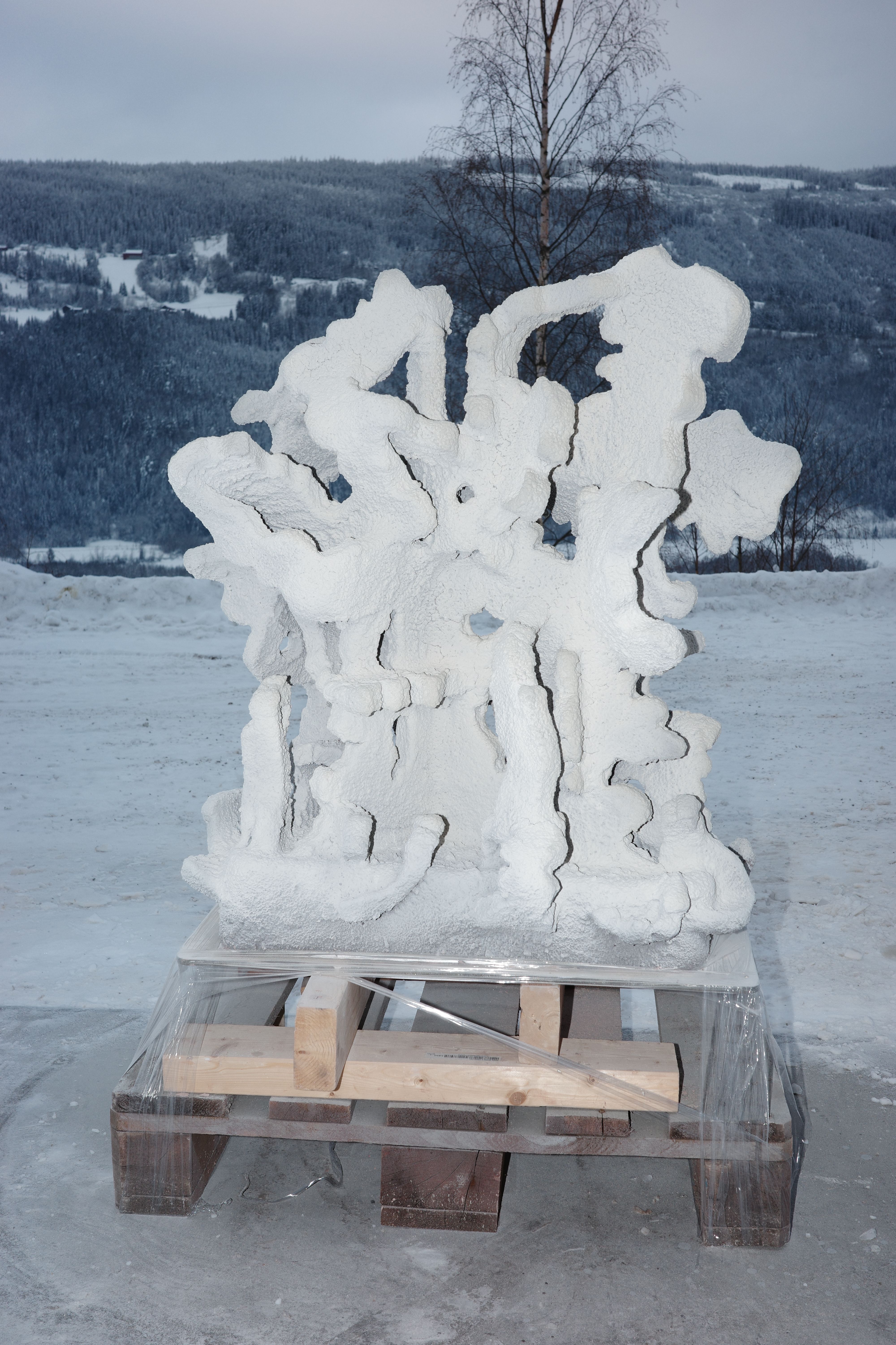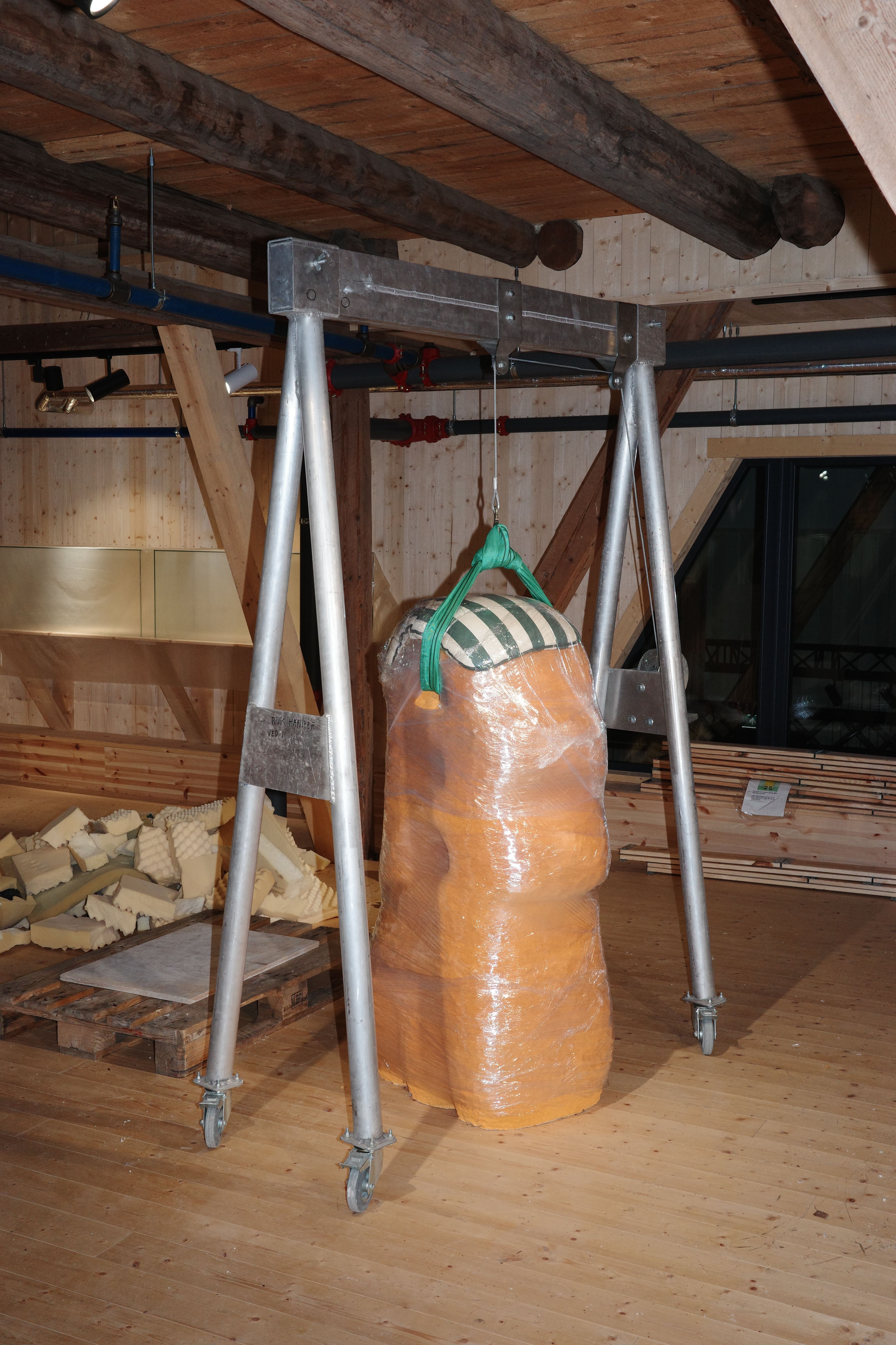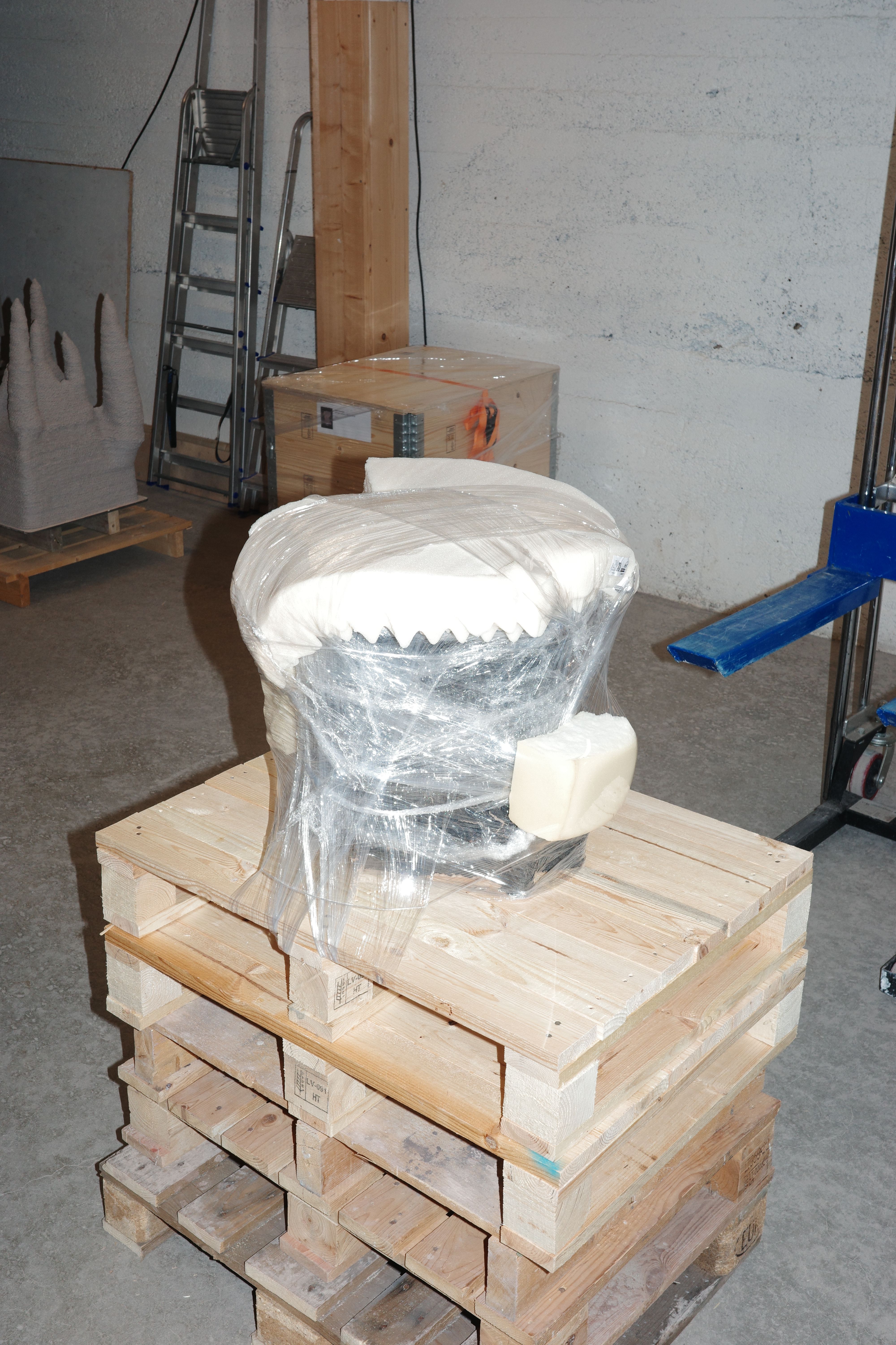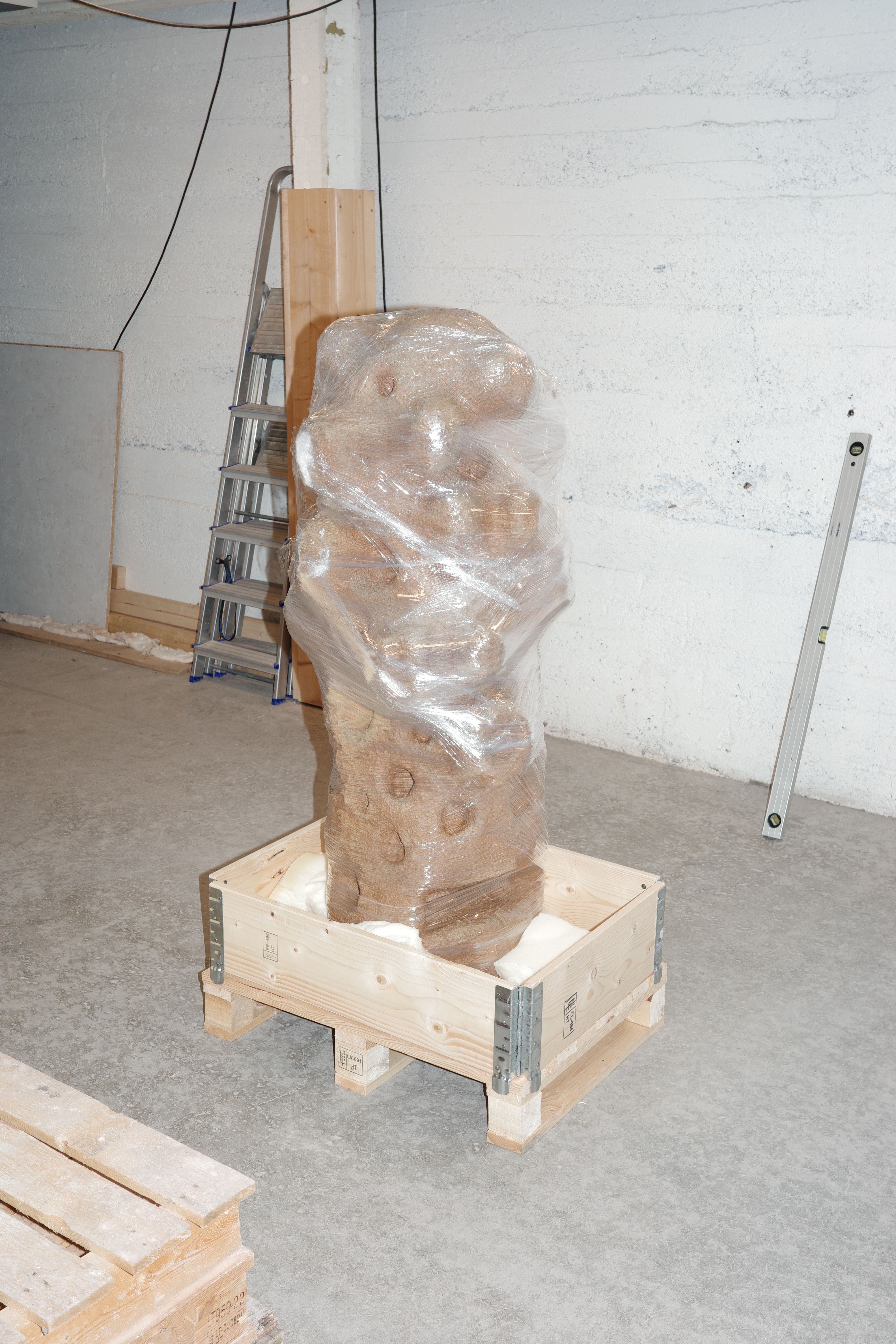 Packing. Foam and plastic wrap. I place pieces of foam on the points of the sculpture that are sticking out. By wrapping the sculpture and going several rounds underneath the pallet, the sculpture is held in place during transport. Pallet frames are then stacked to the right height before a lid and cargo straps secure the whole box structure together. It is important that a piece of foam presses the sculpture down, with the help of the strap over a plywood lid.