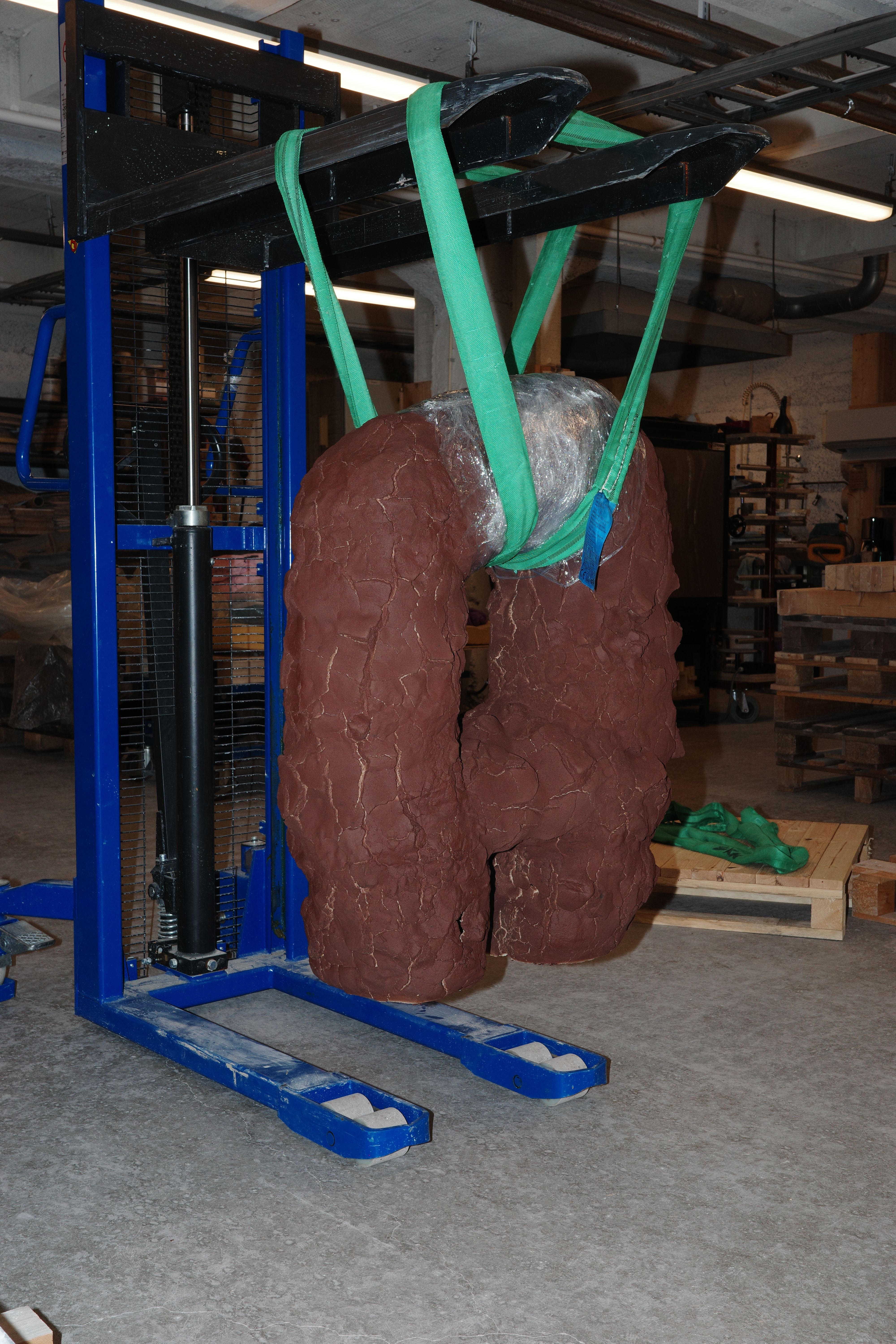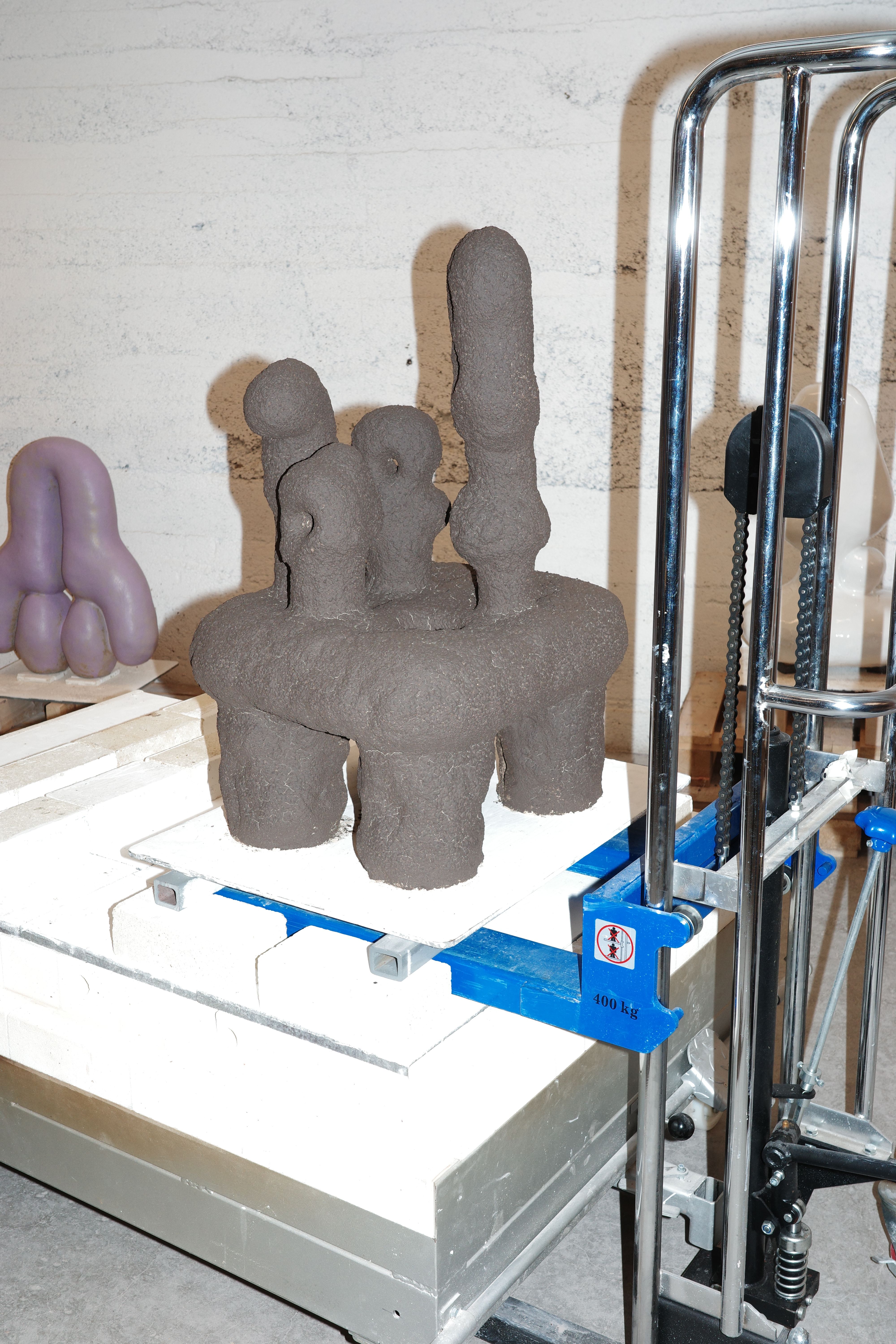 Lifting the ceramic sculptures off the oven plates that they were made and fired on. This can be a bit difficult, but with these manual pallet lifters it is quite easy. Many of my sculptures have holes in them. A functional hole.
