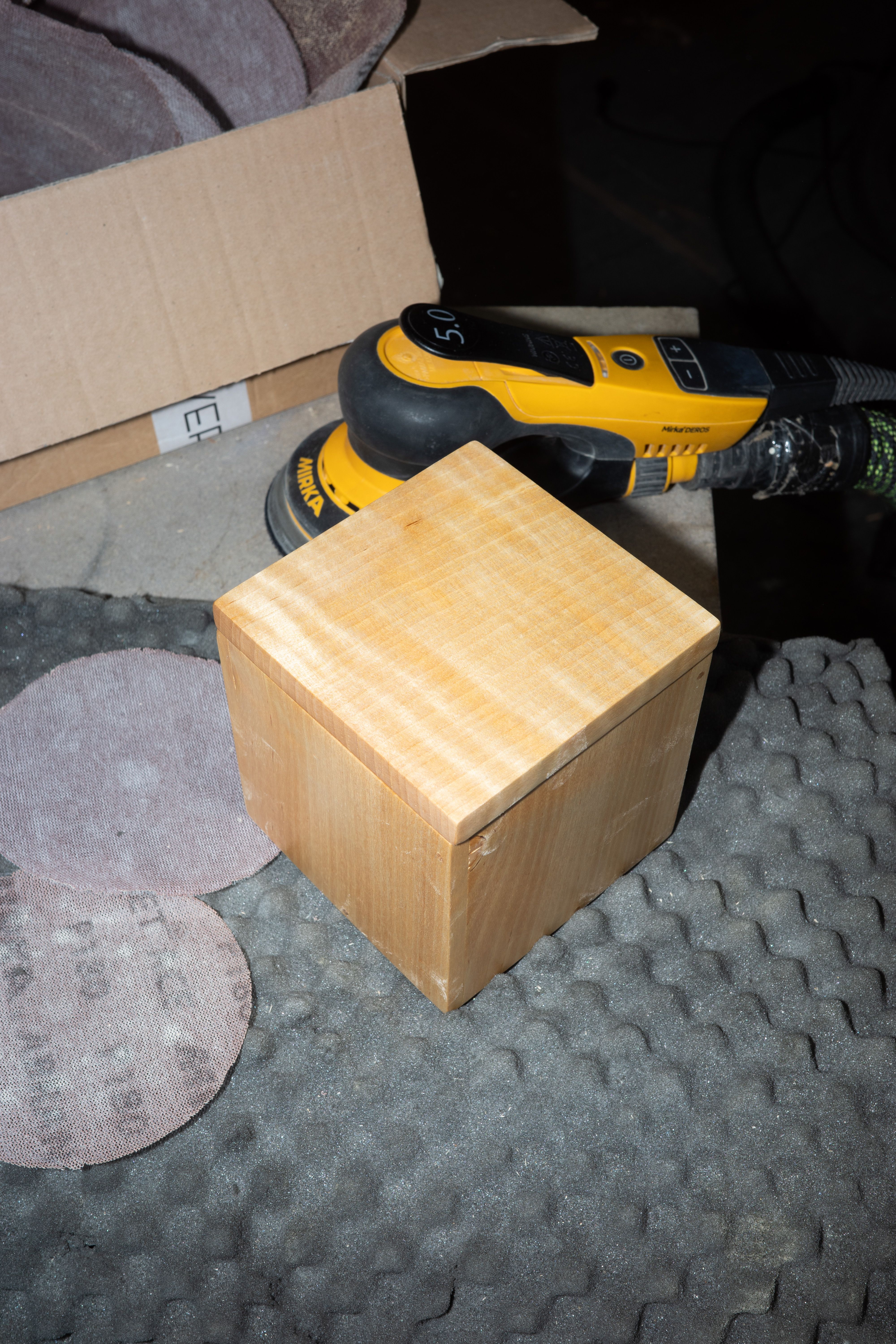 Finishing the gifts for Christmas. This box got a lid. It is made of birch and has a slightly wavy grain structure in it, which birch often does. I always use my Mirka sanders for flat sanding jobs like this, and then I finish with Kirjes oljevoks.