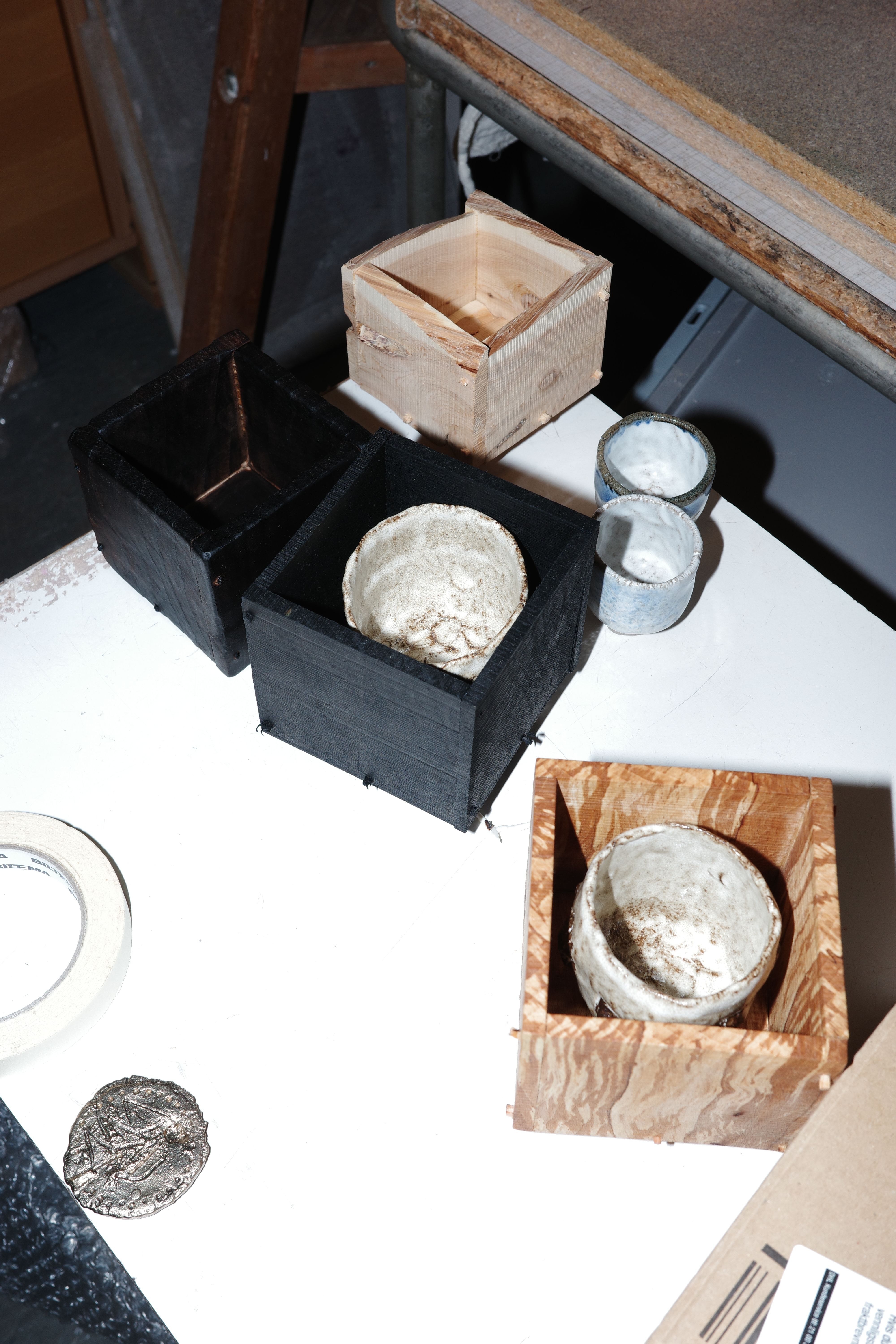 I had to get started on making Christmas gifts. I never had a bandsaw until this October. I always wanted my workshop to stay lightweight and easy to move, but I have added some weight to it lately. The bandsaw opens up so many possibilities and makes it much easier to make my own planks from the wood I have lying around. Here are some quick, rough boxes to house ceramic cups. They are made from juniper, beech and supress. The supress is burned and then brushed with a brass brush.
