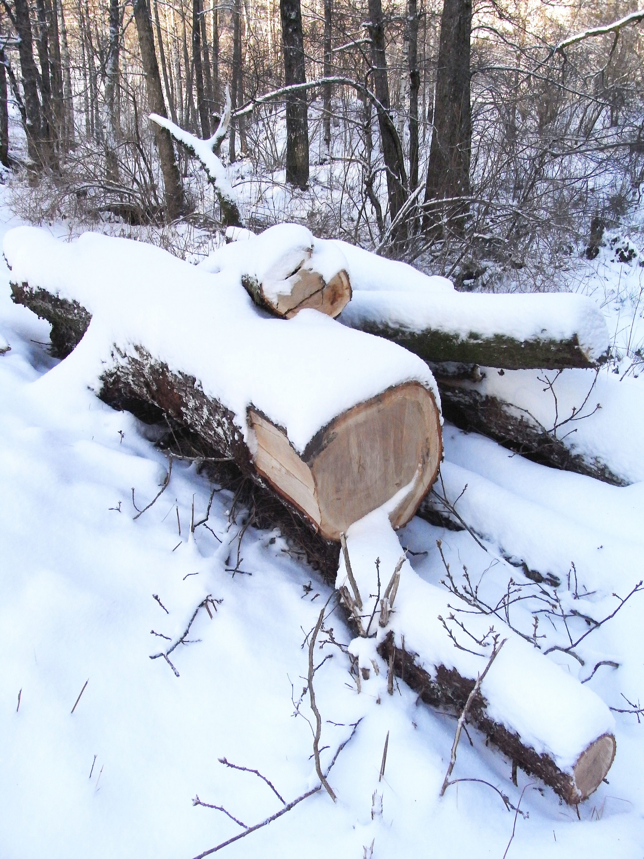 I got a tip about a large storm-felled oak that the municipality was dealing with in a forest nearby. I went for a run in the winter sun, at -8 °C, to see if it could be something for a future project. It was a super old oak that had fallen onto a wooden bridge. The lowest and largest part of the tree is huge in diameter, but looks very dangerous to start chainsaw work on. It could easily fall over or catch the blade. The pieces in the picture were from further up the tree, and these look like something I could handle. Oak can be left outside for many decades, so it is an interesting material to think about for outdoor sculptures.
