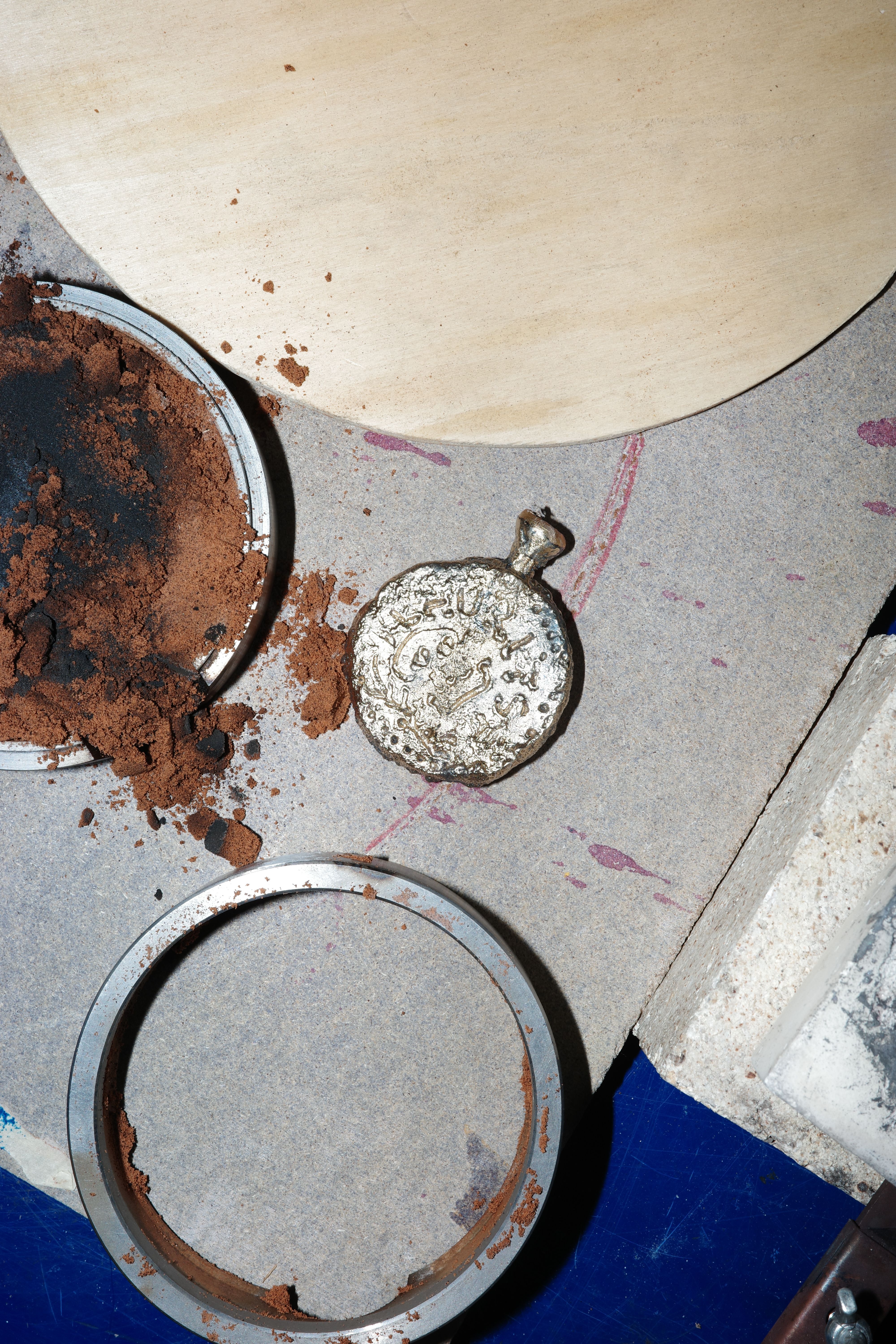 Casting experiment with bronze. I was not sure it would work to use my torch to melt the bronze in a tiny crucible, but it did. I made a small model of a large coin so I could use it as a gift for a nephew who is into pirate-type things. It was fun to see if I could model it in something clay-like, but moisture from natural clay would have created a damp mould, and possibly an explosion. I found some plastic play dough, and it gave a really nice, naïve look to the simple coin. The sand stuck a little to the play dough, but that also helped to create an interesting surface.