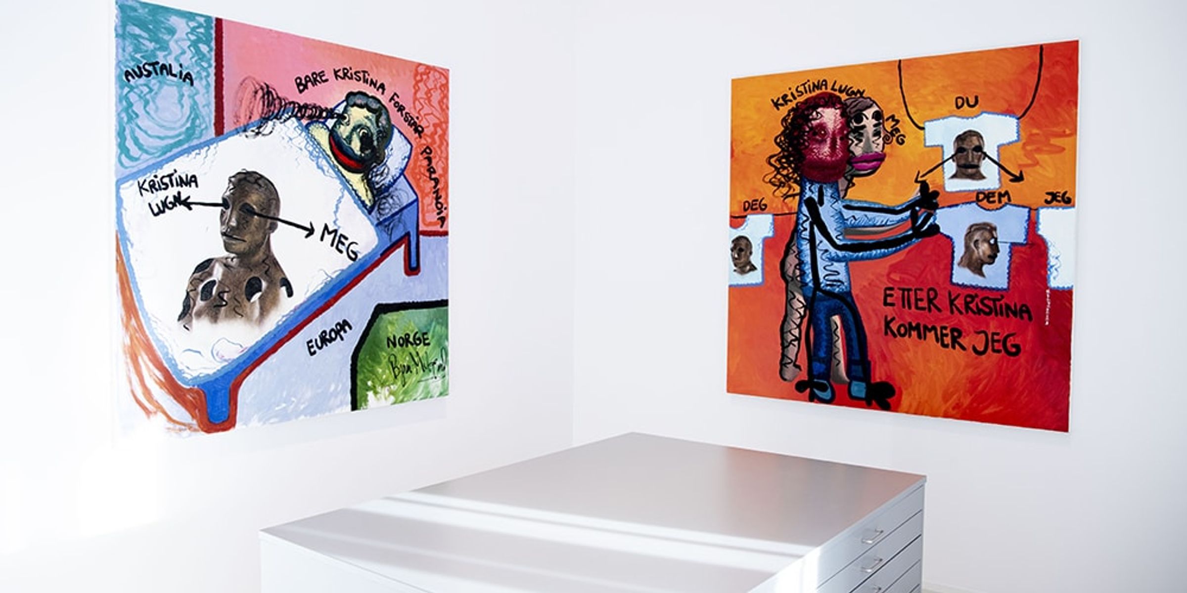 Bjarne Melgaards utstilling En ost pÄ en sydhavsÞy og Chill out med Kristina Lugn bestÄr av verk laget med blekk, tusj, og oljemaling. Utstillingen pÄ BGE Contemporary Art Projects i Stavanger er delt opp i tre seksjoner, hvorav en bestÄr av selvportrett, en seksjon er verk med «Chill out» i tittelen, mens resten er basert pÄ poesien til den svenske dikteren Kristina Lugn. Sistnevnte kategori er produsert spesifikt til denne utstillingen, og ifÞlge galleriet er disse verkene sÄ nymalte at malingen ikke har tÞrket enda.