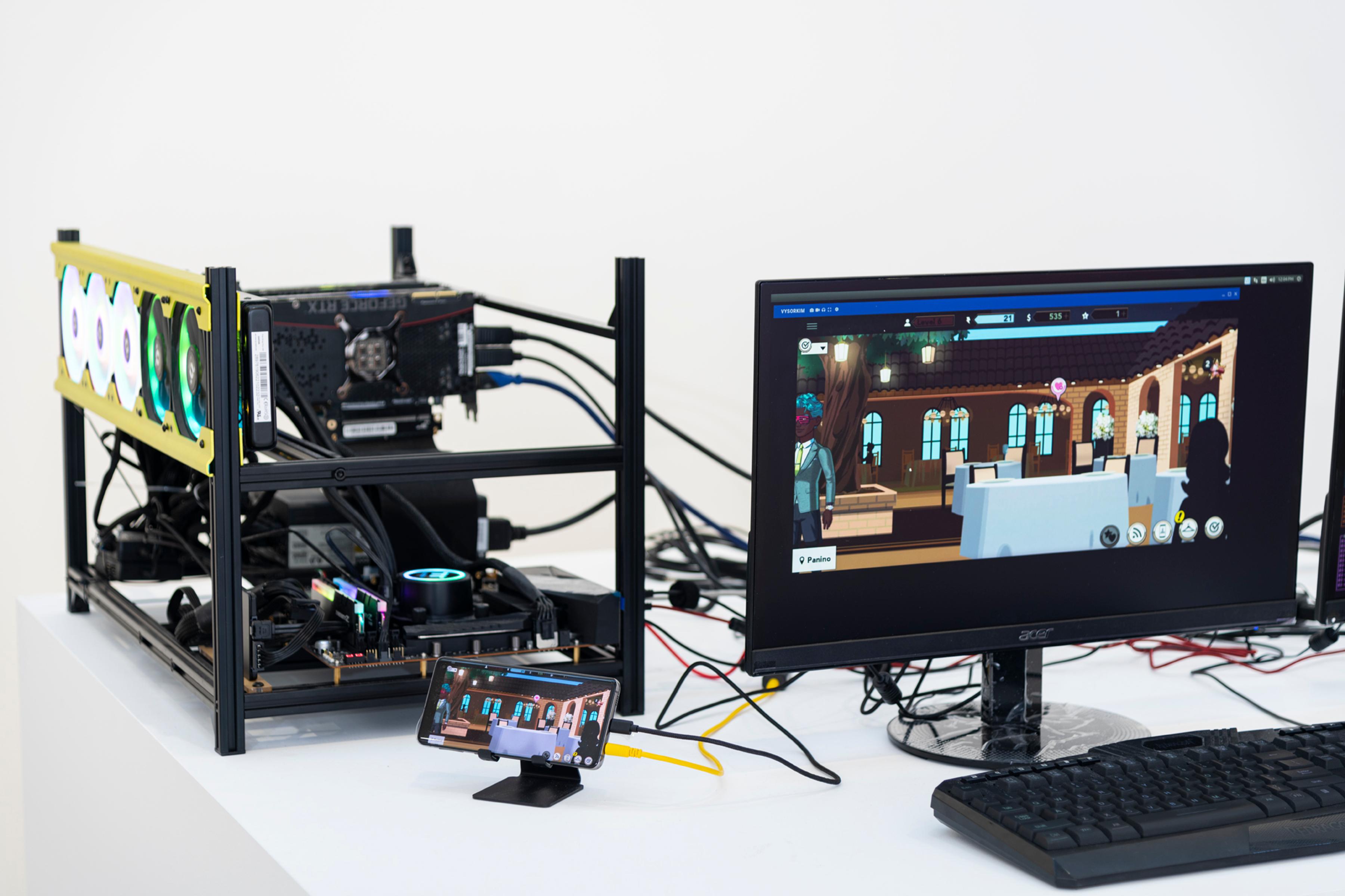 Cory Arcangel. /roĘËdeÉŞoĘ/ Let's Play: HOLLYWOOD, 2017-2021. Custom built high performance computer rig (AMD Ryzen 9 5950X 16-core 32-Thread Unlocked Desktop Processor central processing unit, Rog Crosshair Viii Dark Hero motherboard, G.SKILL 64GB (2 x 32GB) Trident Z Neo Series DDR4 PC4-21300 2666 MHz 288-Pin Desktop Memory Model F4-2666C18D-64GTZN random access memory, (x2) EVGA 24G-P5-3975-KR GeForce RTX 3090 XC3 Ultra Gaming graphics processing units' & Corsair Professional Series AX 1200 Watt Digital ATX/EPS Modular 80 PLUS Platinum (AX1200i) power supply, various peripherals), custom built Deep-Q Learning RPG playing software bot with system sounds by Daniel Lopatin (Oneohtrix Point Never), Kim Kardashian: Hollywood casual free-to-play role-playing Android game, Android phone, amplifier & speakers, various cables. (Installation view: Century 21, Greene Naftali Gallery, New York, USA, March, 2021 - April, 2021) Photo: Zeshan Ahmed. Courtesy: the artist, Greene Naftali.