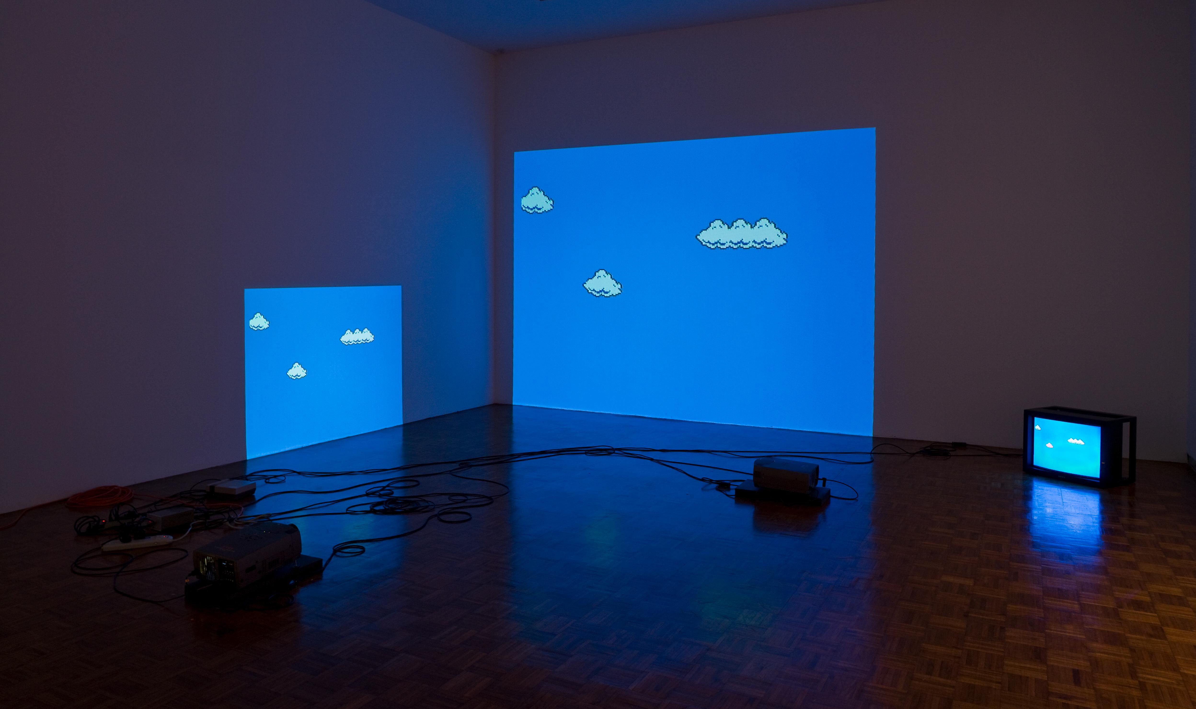 Cory Arcangel, Super Mario Clouds, 2002 (installation view, Synthetic, Whitney Museum of American Art, New York, January 22-April 19, 2009). Handmade hacked Super Mario Brothers cartridge and Nintendo NES video game system. Whitney Museum of American Art, New York; purchase with funds from the Painting and Sculpture Committee 2005.10. Photograph by Sheldan C. Collins.
