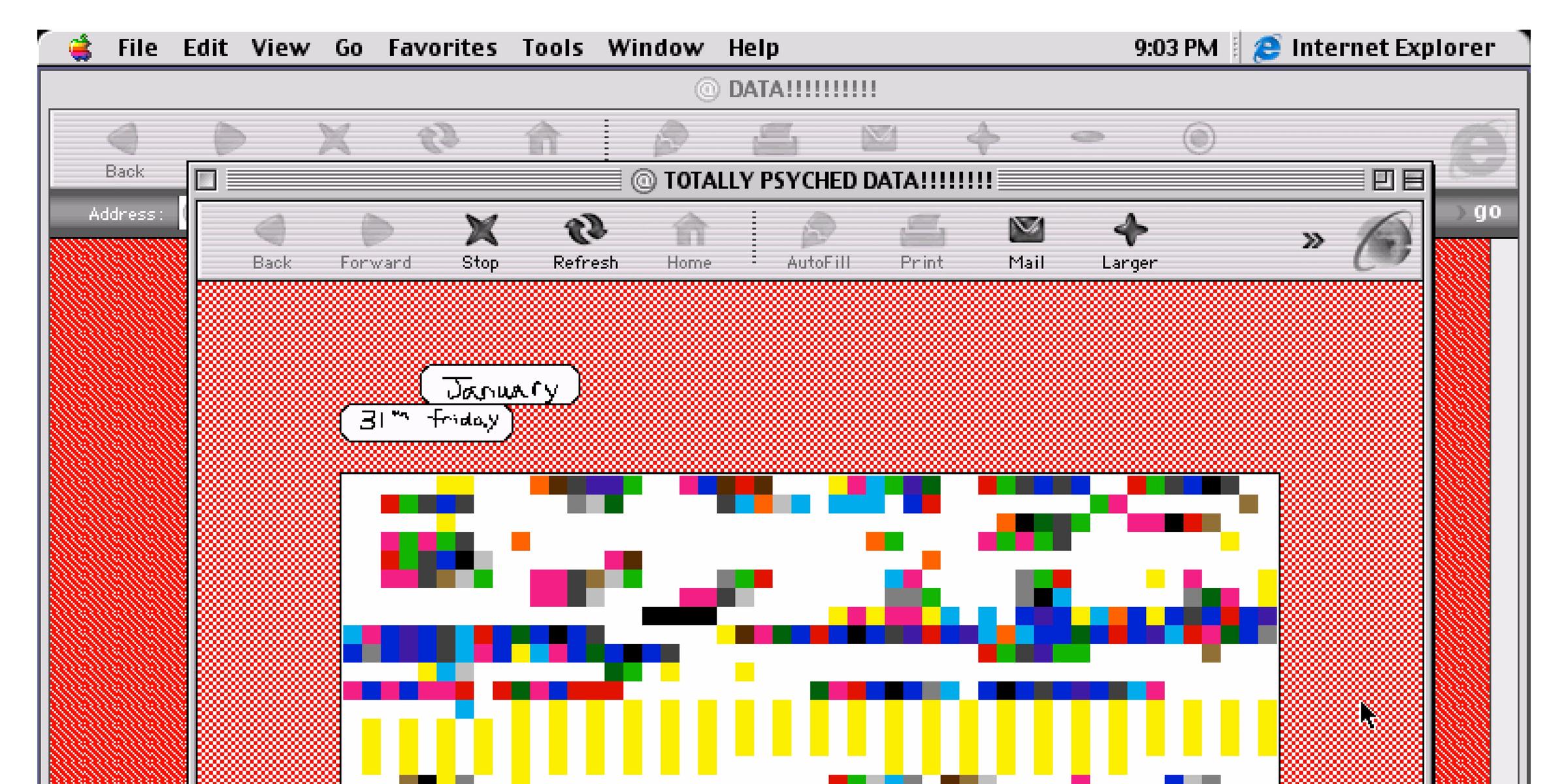 Cory Arcangel. Data Diaries, 2003. Video installation, 62 single- channel videos (optional selection). Photo: Cory Arcangel. Courtesy: the artist, Rhizome. Historically accurate screen shot created using bwFLA, Emulation as a Service, University of Freiburg. Data Diaries is a commission of New Radio and Performing Arts, Inc., dba EtherâOre, for its Turbulence web site. It was made possible with funding from the Jerome Foundation.
