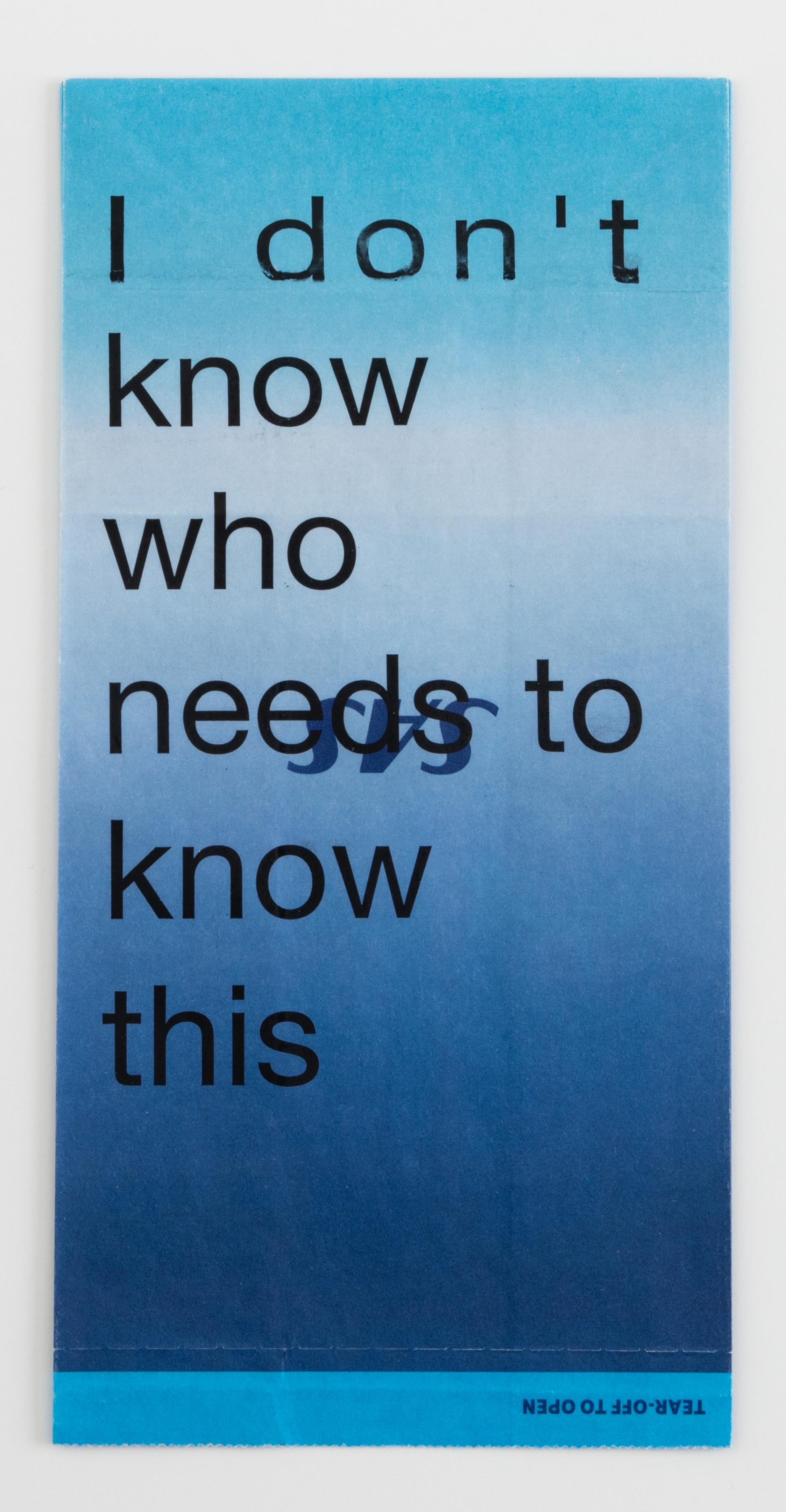 Cory Arcangel. I don't know who needs to know this, 2020. Hewlett Packard home office LaserJet on found Scandinavian Airlines vomit bag. Photo: Zeshan Ahmed. Courtesy: the artist, Greene Naftali Gallery.