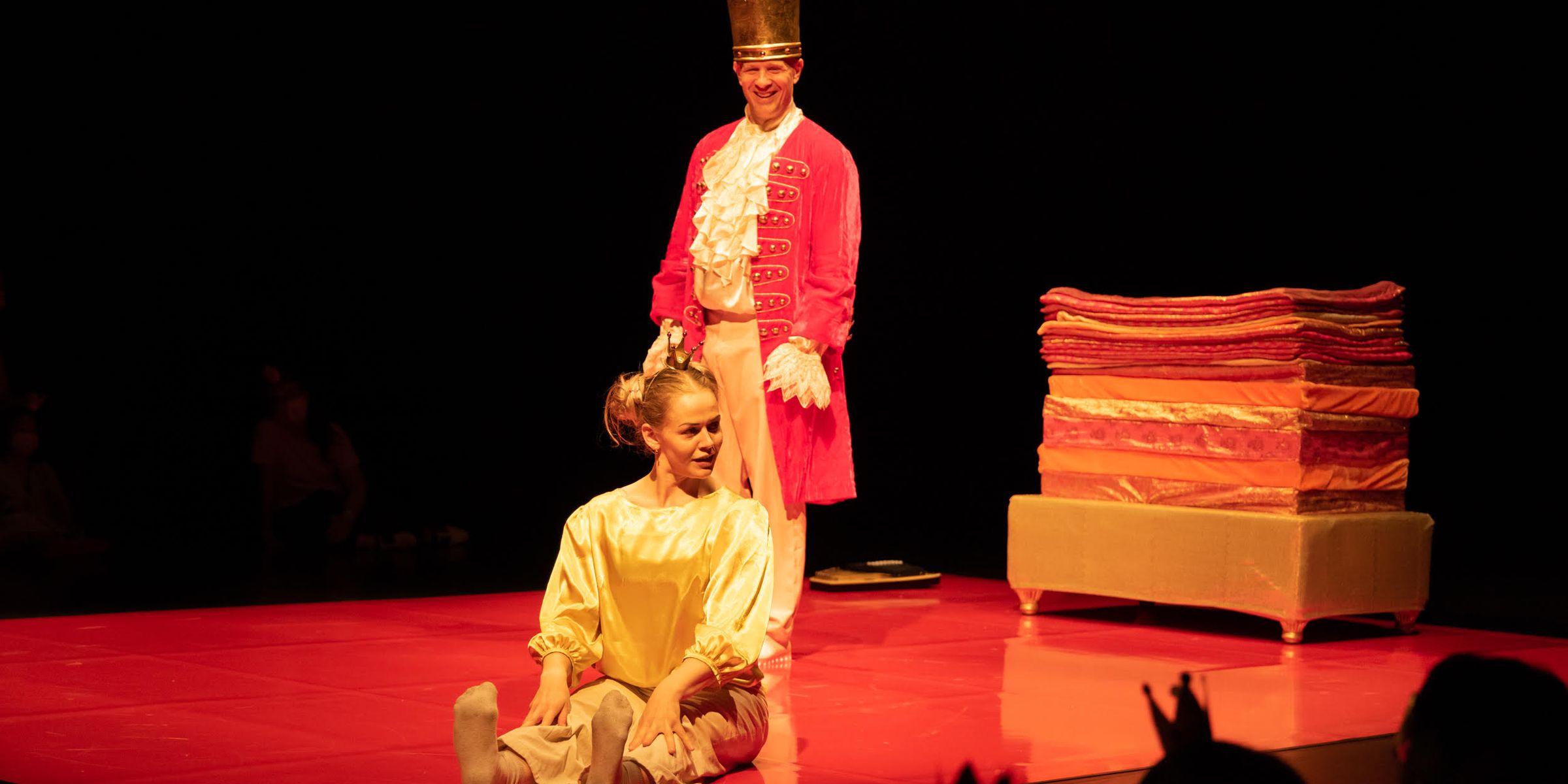 Selv om den lille sengen med de tjue madrassene og ederdunsdynene står langt bak i scenerommet gjør den enkle lyssettingen, i form av spotter med naturlig lys, og rød dansematte at den syns veldig godt. Denne effektive og lune lyssettingen preger hele forestillingen. Prinsessen er iført en gul slikeaktig bluse med rysjer bak, beige løs linbukse og en liten krone mellom to hårdulter. Kongen har en overdimensjonert lyssatt krone, rød bukse, velurfrakk og hvite sko med røde lys i sålen.