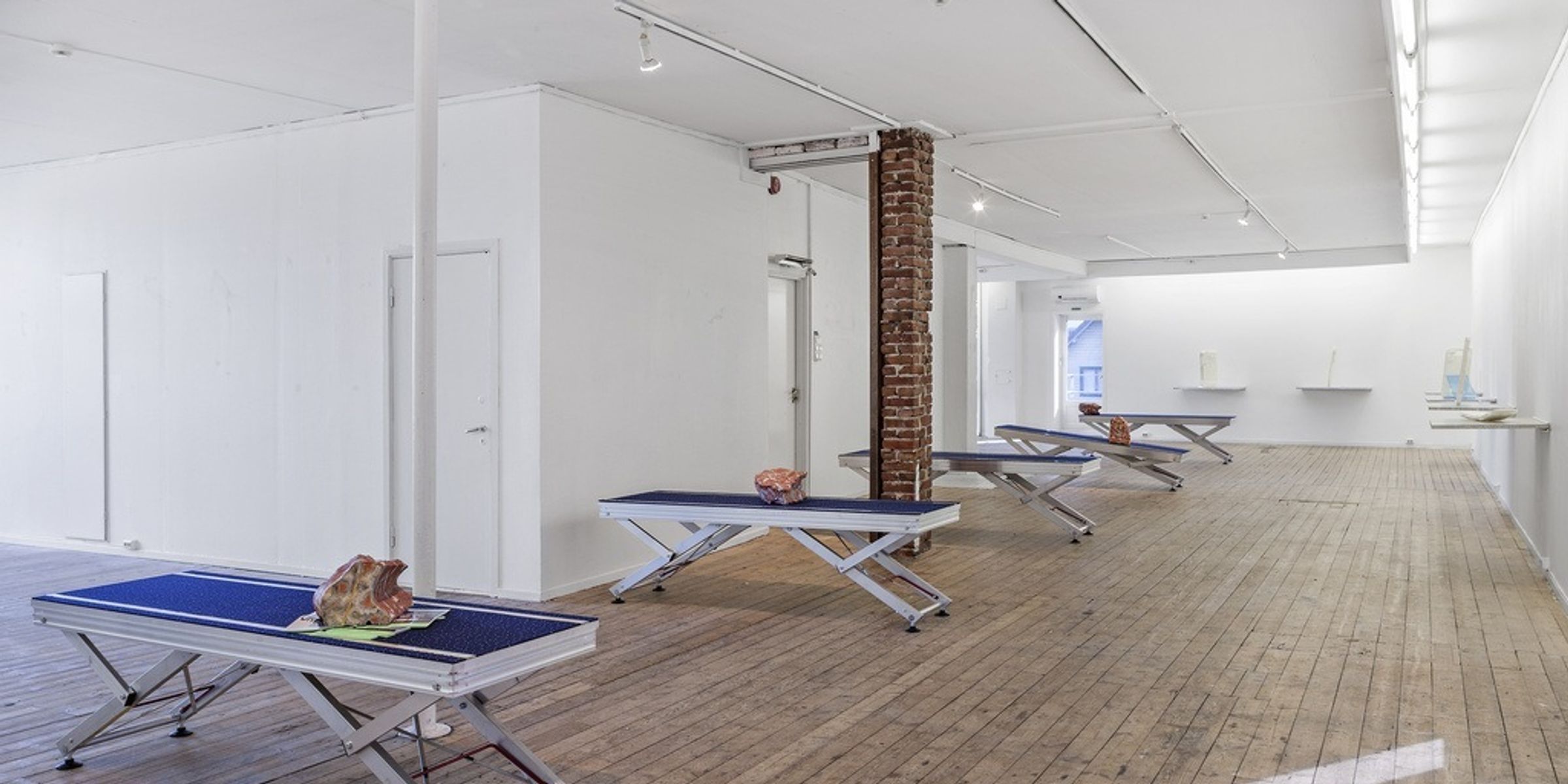 Extended Operations presents two series of artworks that run in parallel through the exhibition space. One consists of stretcher-like structures lined up on the floor, dressed in a carpet that alludes to an airplane’s center aisle. Each of the 'stretchers' are adorned with a hunk of meat, which in reality is marble cut with computer controlled lasers. The second series presents white, 3D-printed renderings of damaged cellphones on a row of shelves mounted on the wall.